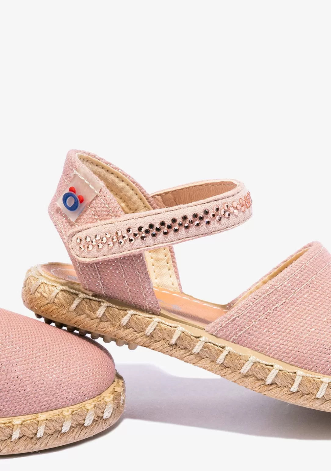 Alpargatas de bebé en color rosa. Parte frontal cerrada. Talón sujeto. Cierre con tira adherente adornada con strass que garantiza la sujeción del pie. Suela de yute con exterior de goma.