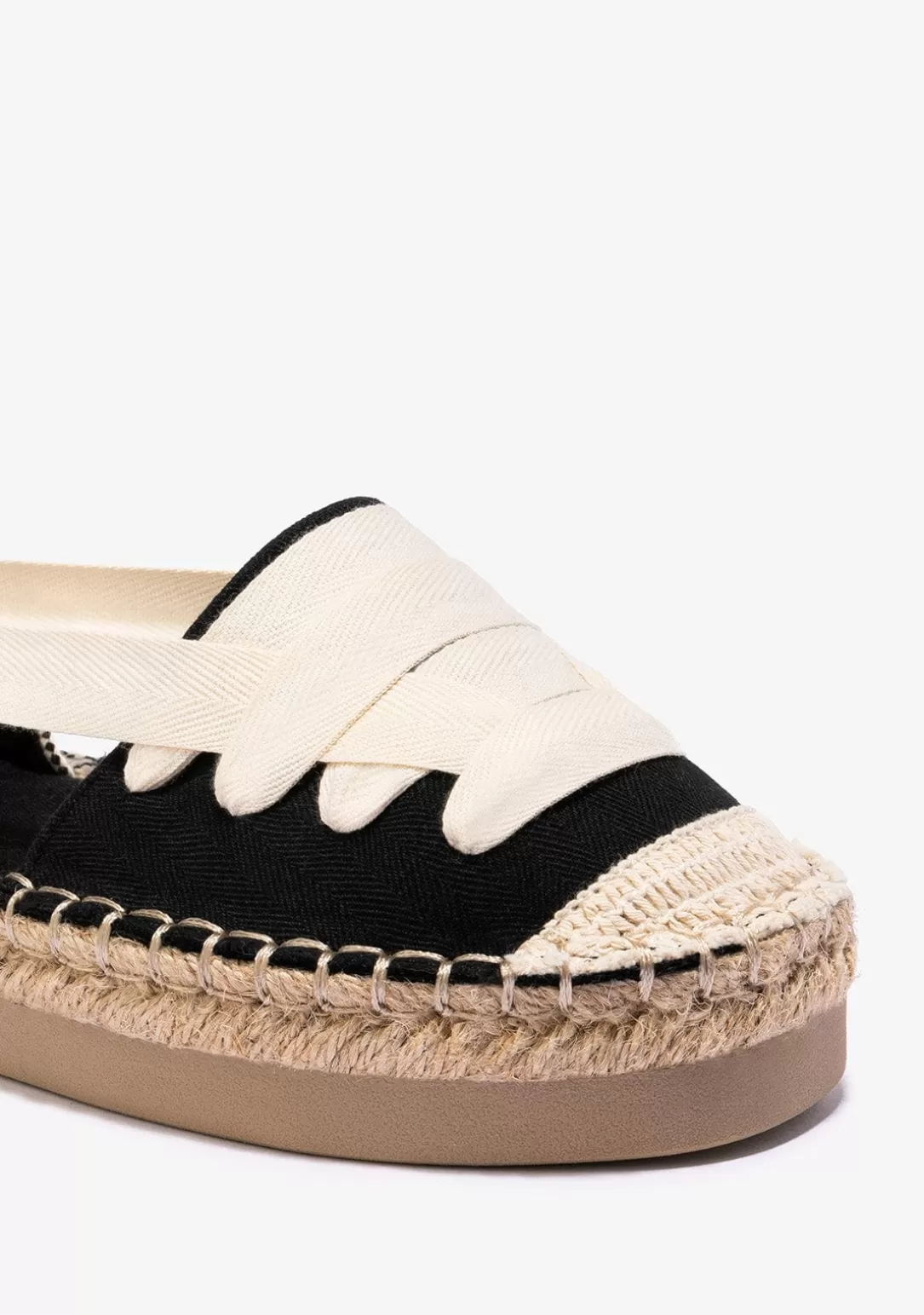 Las nuevas alpargatas en color negro están confeccionadas en lona, con puntera cerrada, yute y suela de goma. También disponen de cierre mediante cintas que unen desde la parte frontal a la zona trasera y se anudan en el tobillo mediante lazada.