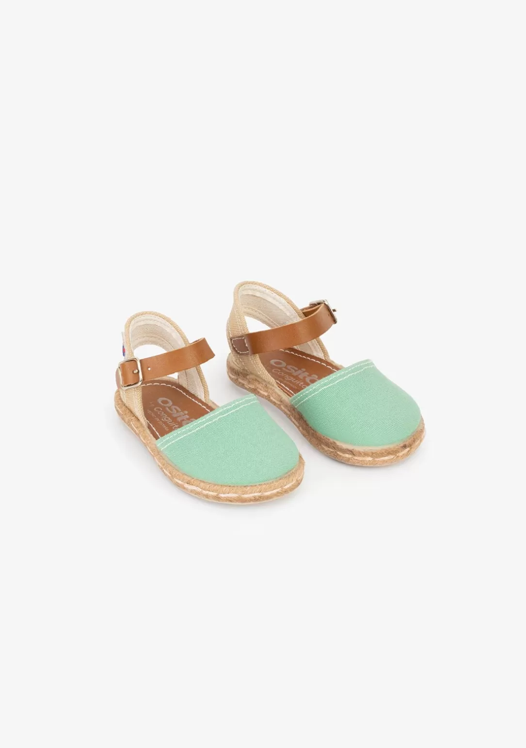 Alpargatas valencianas infantiles de color verde brasil fabricadas en material textil, con suela de yute y cierre de pulsera con hebilla. La planta garantiza la transpirabilidad al pie y el piso es de goma, facilitando un gran confort. Unas sandalias cómodas e ideales para esta primavera-verano.