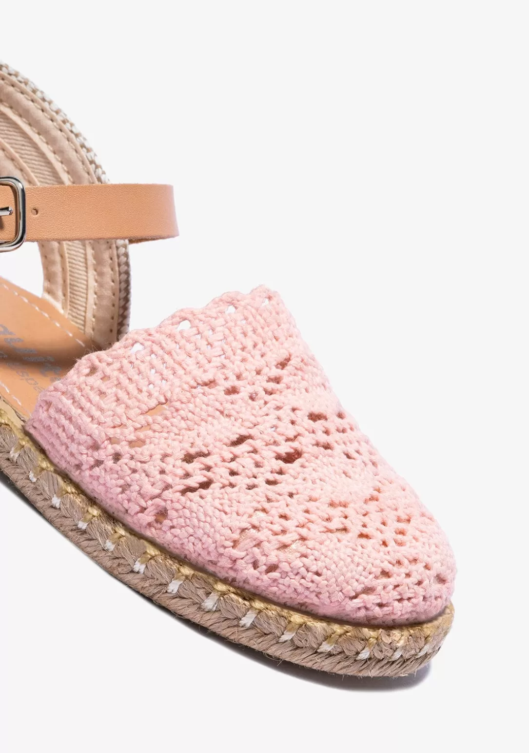 Alpargatas rosa con detalles en blanco y marrón. Tiene la parte frontal cerrada y de macramé rosa. Su cierre es de pulsera con hebilla para una mayor sujeción al pie. La pulsera es marrón. Cuenta con el logo de Conguitos en la parte trasera.