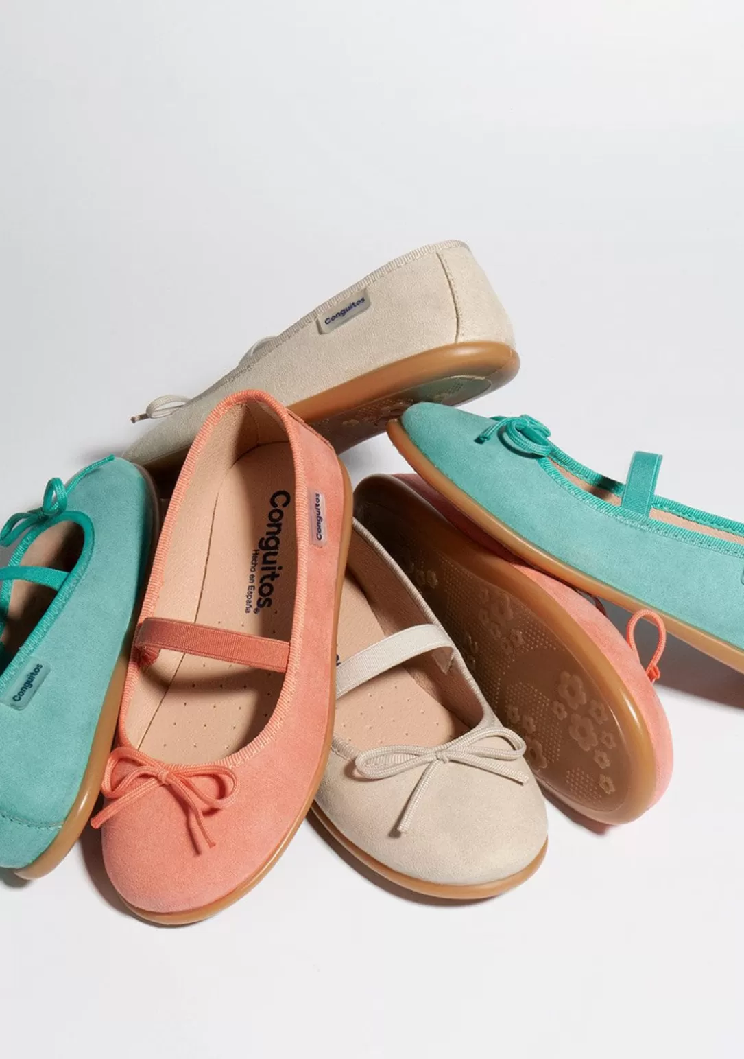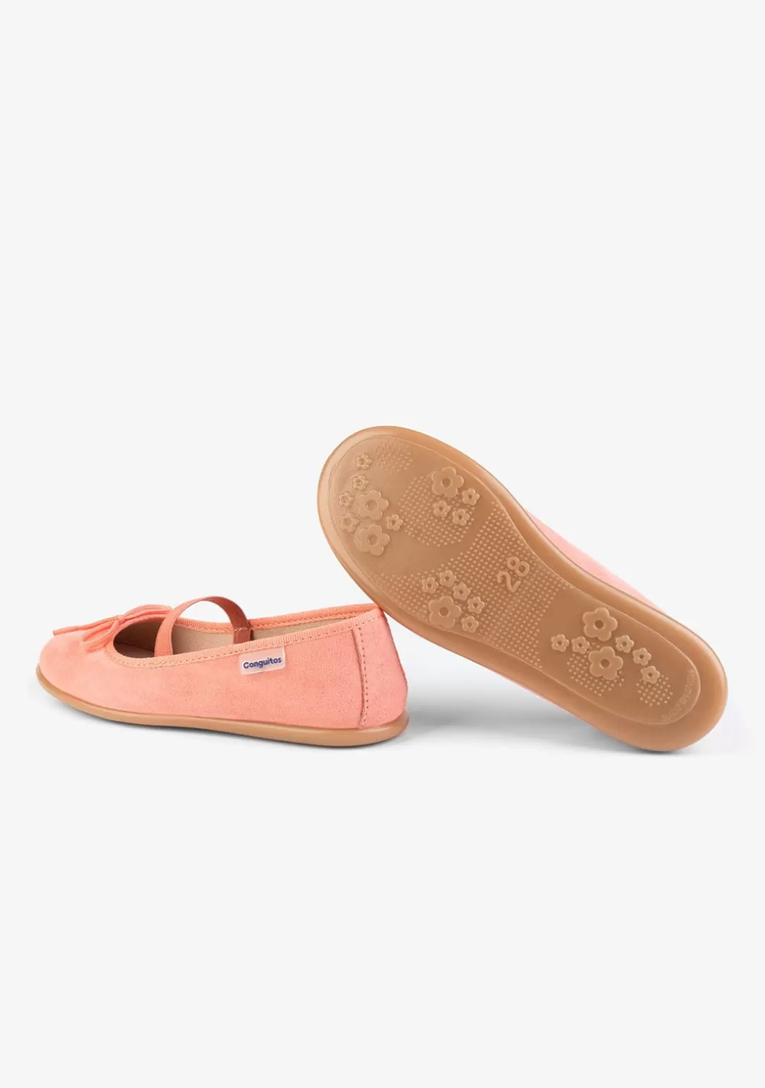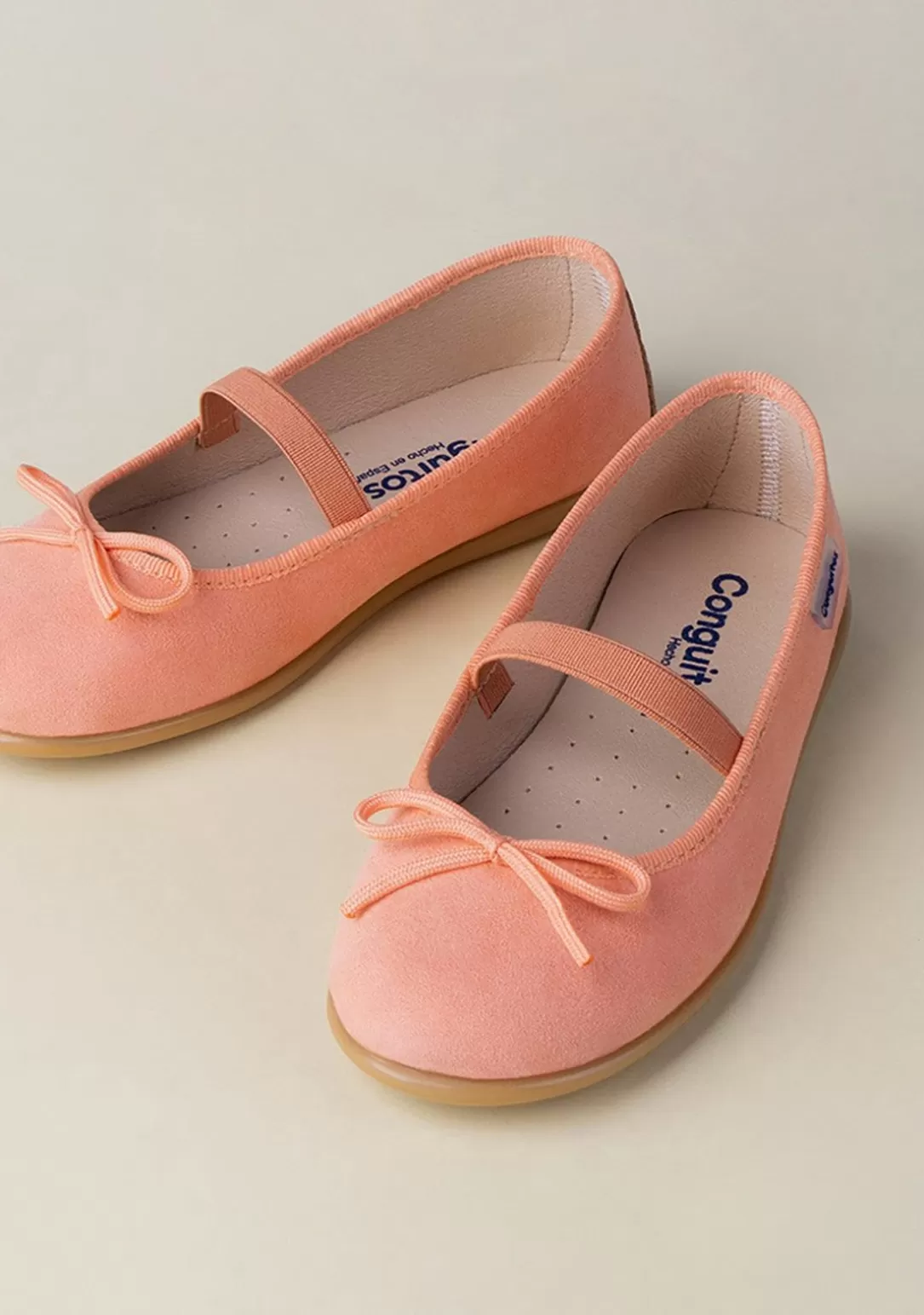 Bailarinas fabricadas en microfibra de color coral, con tira elástica en el empeine para una correcta sujeción. Disponen de plantilla transpirable en material textil. Estas manoletinas tienen la suela de goma para máxima comodidad de la niña y detalle de lazo en la puntera. Disponible en más colores.
