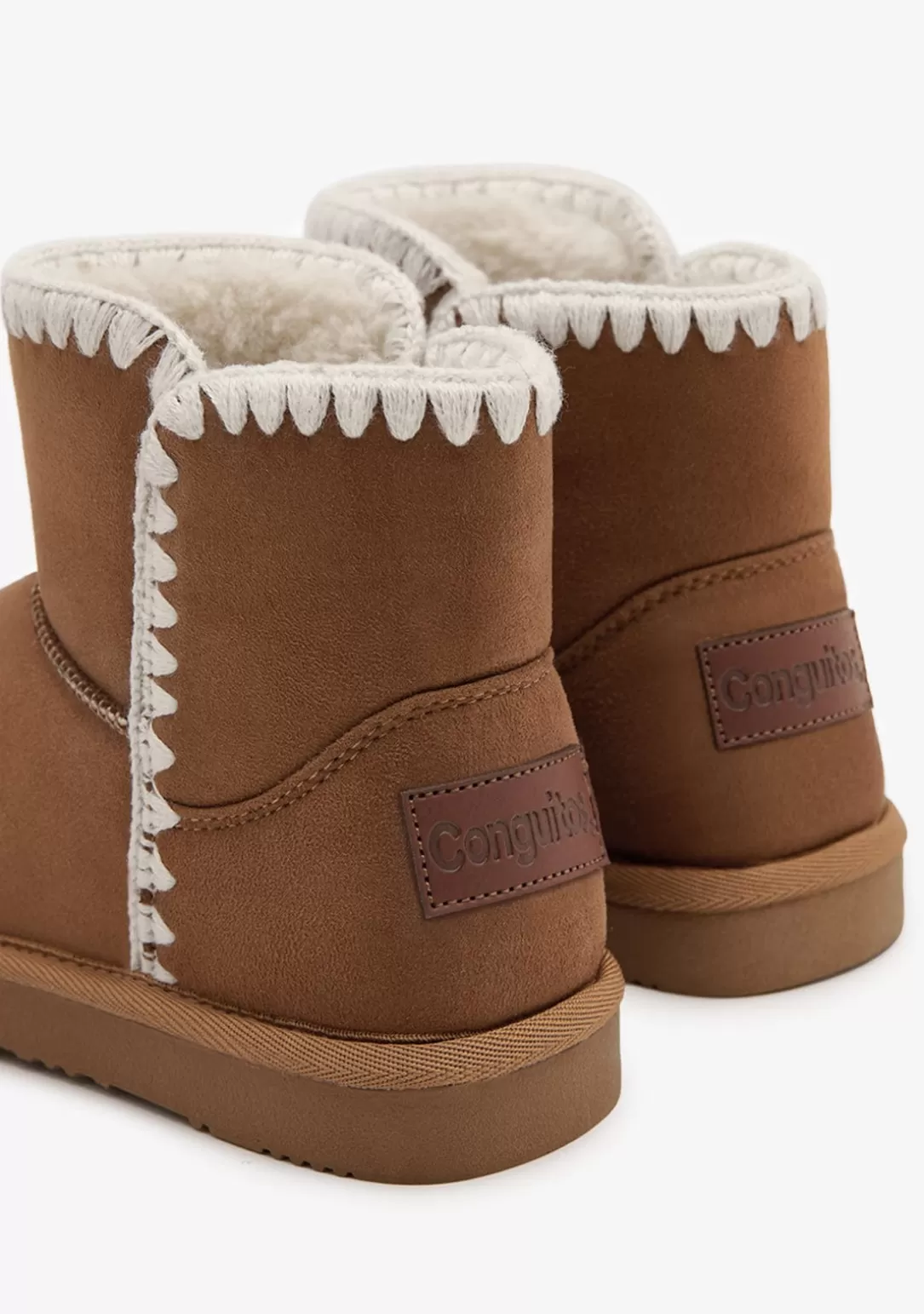 Este diseño está confeccionado con forro y plantilla interior en pelo sintético perfecto para mantener abrigados a los más pequeños. Caña más baja que facilita ponerlas y quitarlas. Su tejido exterior de microfibra cuenta con tecnología Water-repellent, que repele las primeras gotas de lluvia y protege de la humedad. Además, cuenta con detalles bordados en forma de puntada y logo en la parte del talón.
