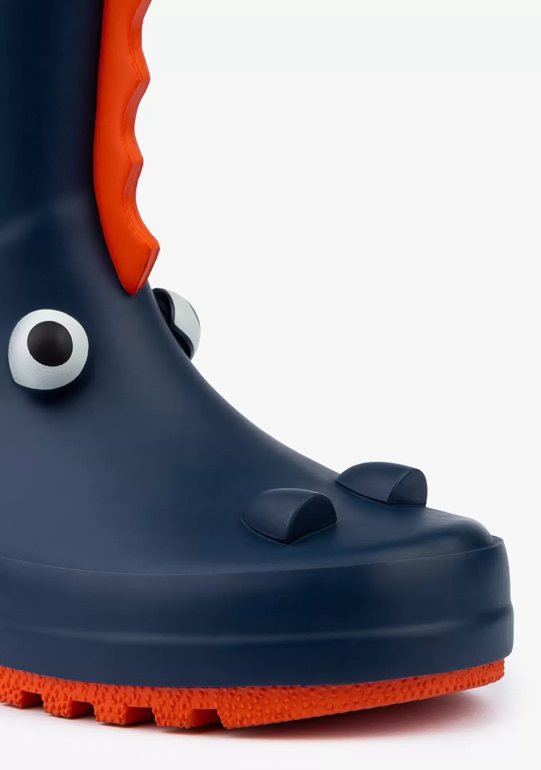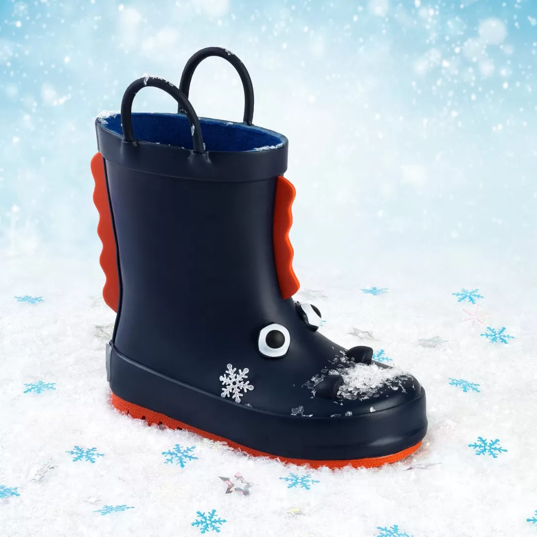 Botas de agua de color azul marino fabricadas en goma impermeable con detalles de dinosaurios. ¡Las botas más divertidas para pisar los charcos! Dispone de suela dentada antideslizante con tiradores tipo asa en la zona superior para una colocación más sencilla. Con detalles de dinosaurios: estampado de dinos y picos rojos en la zona delantera y trasera. Con el interior forrado para aislar del frío y mayor comodidad en la pisada.
