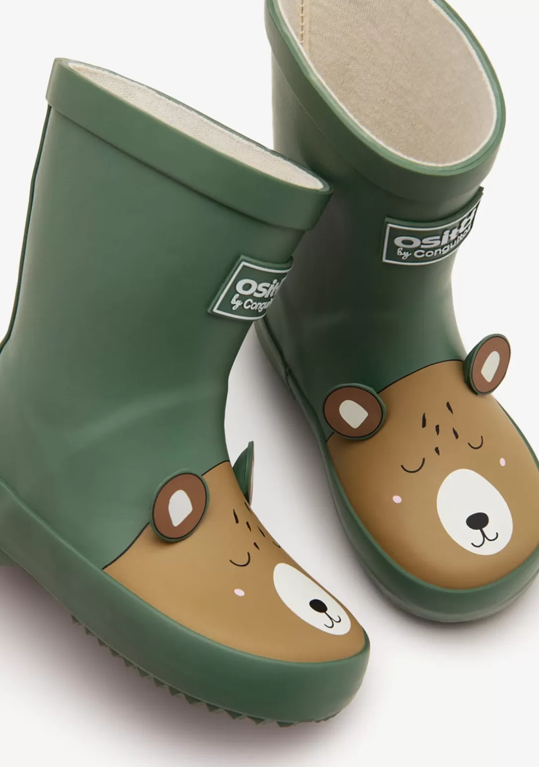 Botas de agua en color verde caqui con detalles de osito en tonos marrones. ¡Para alegrar los estilismos en los días lluviosos!