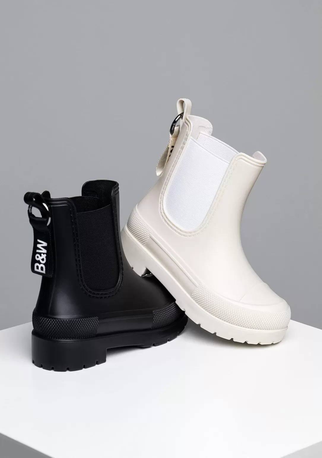 Botas de agua unisex. Confeccionadas en goma lo que las hace totalmente impermeables. Elásticos laterales que facilitan su puesta y la ajustan a la pierna aportando gran sujeción. Suela track para mejor agarre. Detalle trasero con el logo de B&W.