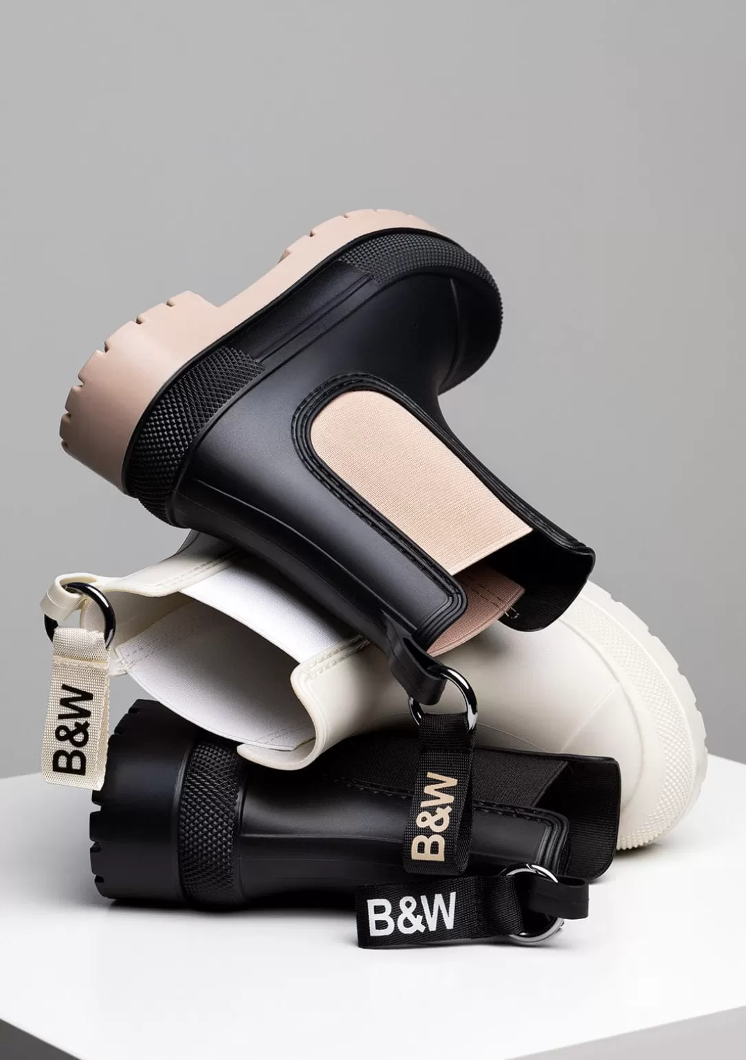 Botas de agua unisex. Confeccionadas en goma lo que las hace totalmente impermeables. Elásticos laterales que facilitan su puesta y la ajustan a la pierna aportando gran sujeción. Suela track para mejor agarre. Detalle trasero con el logo de B&W.