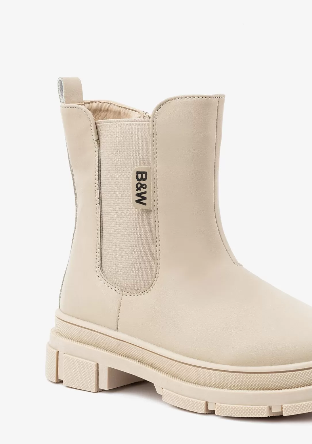 Botines estilo chelsea para niña en color beige, fabricados con napa sintética. Lengüeta en la parte trasera para calzarse con facilidad y cierre de cremallera en el lateral de la bota para una mejor sujeción.