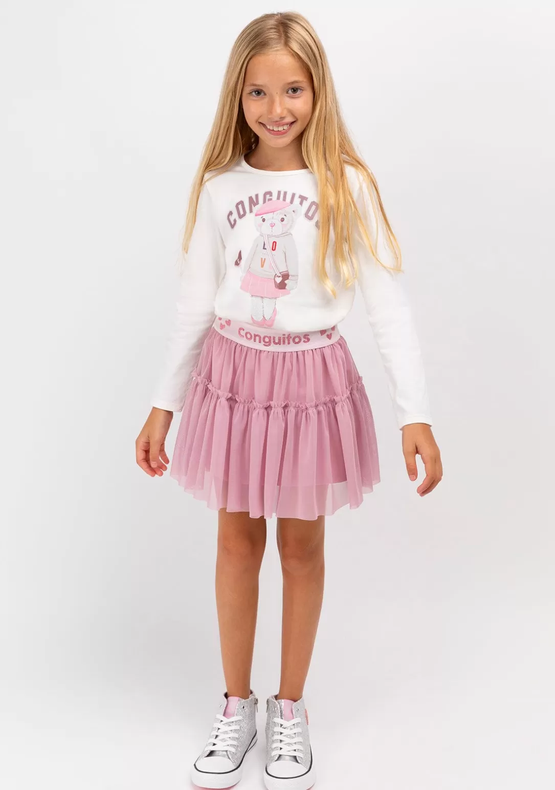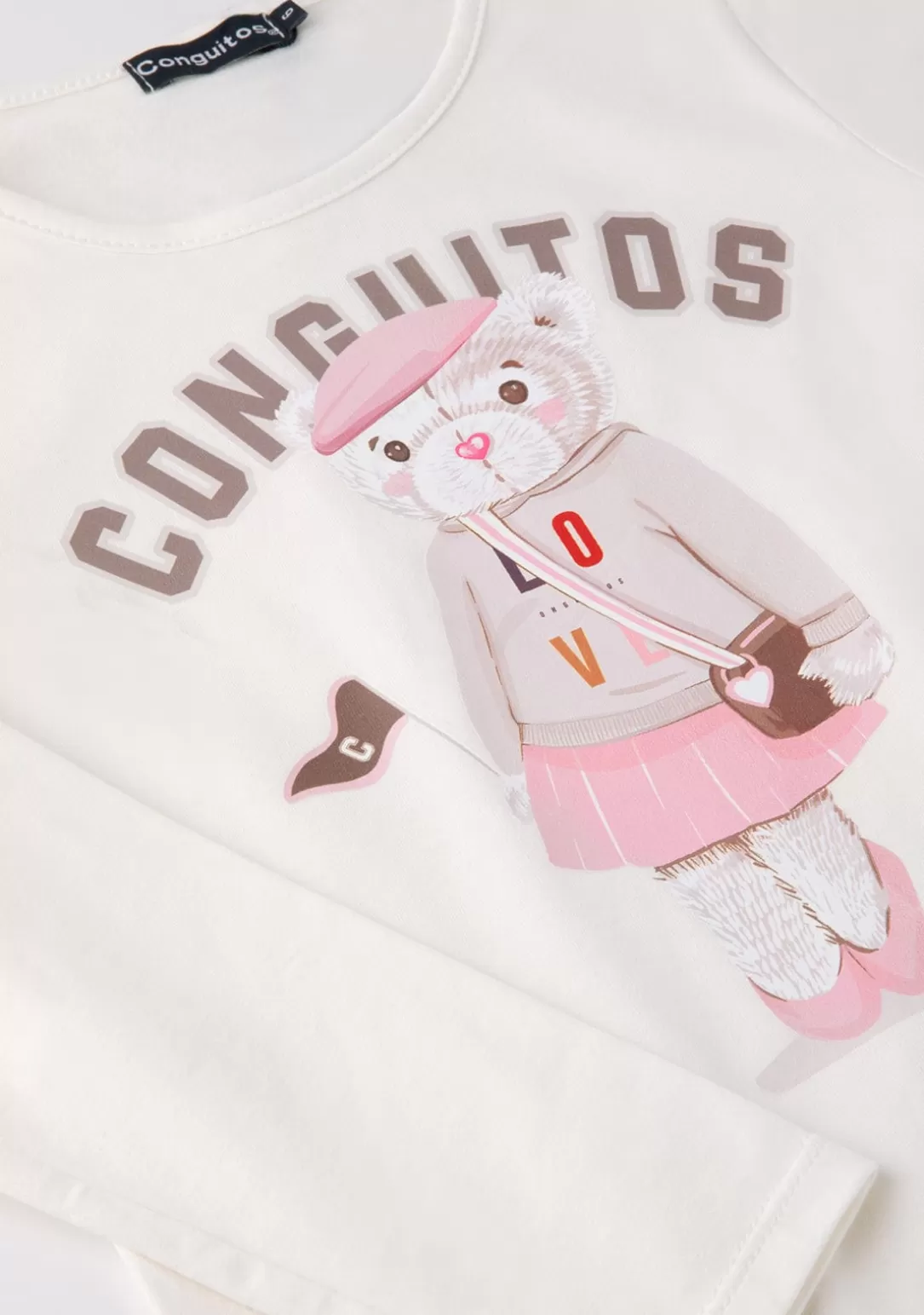 Camiseta de manga larga para niña confeccionada en algodón. Cuello redondo y manga recta. Decorado central estilo university.