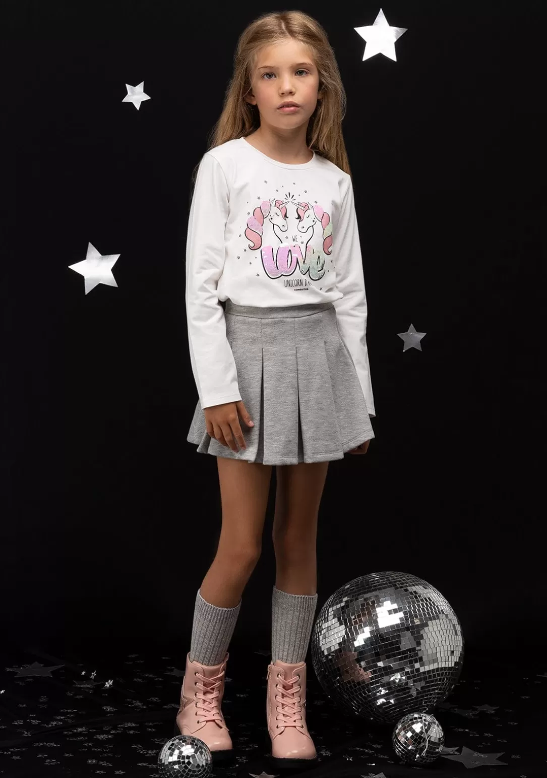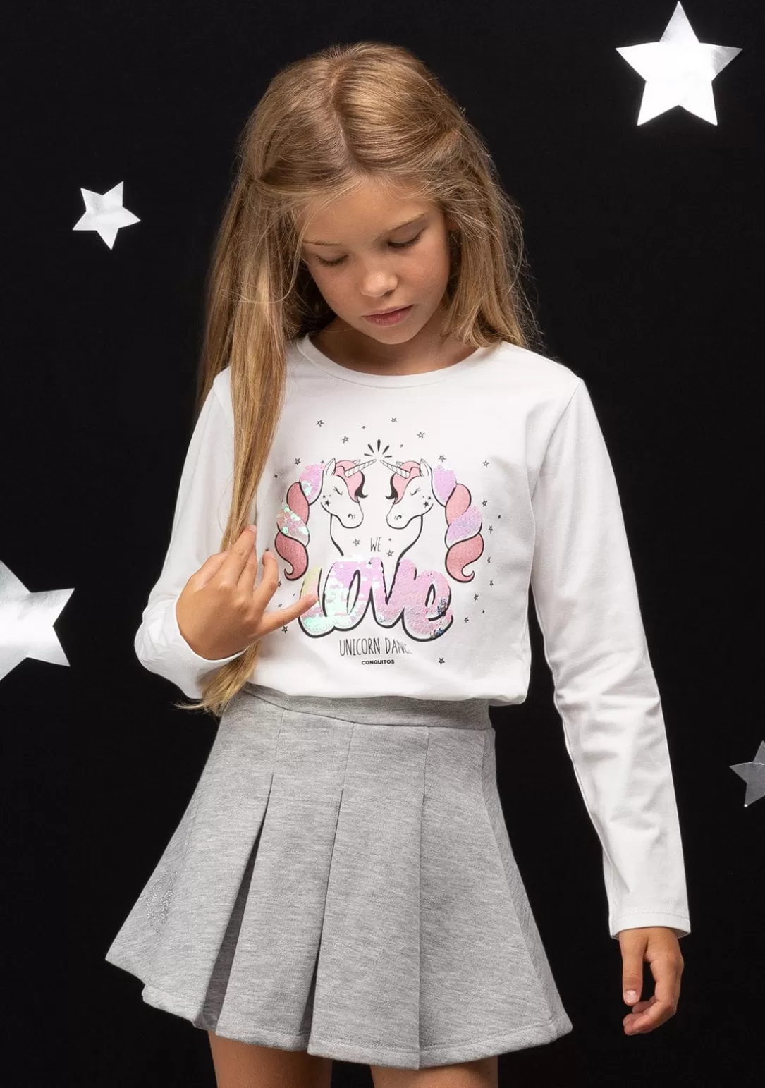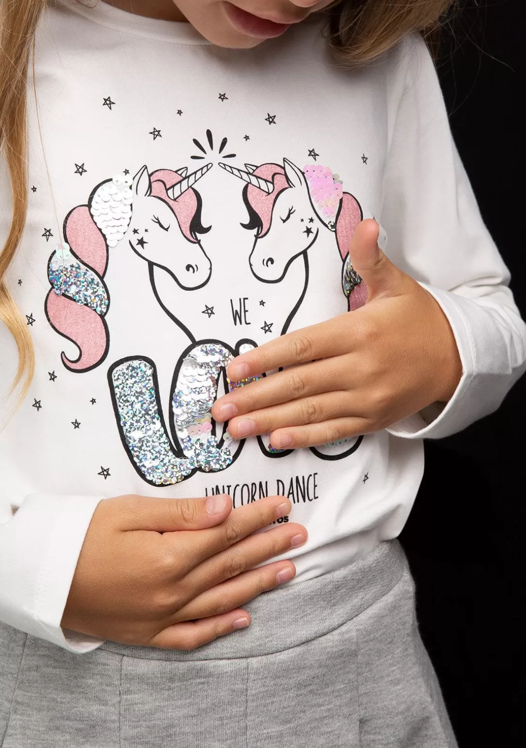 Camiseta de niña con estampado de Unicornios. Con doble lentejuela y purpurina que lo rodean dando un toque de lo más dulce.