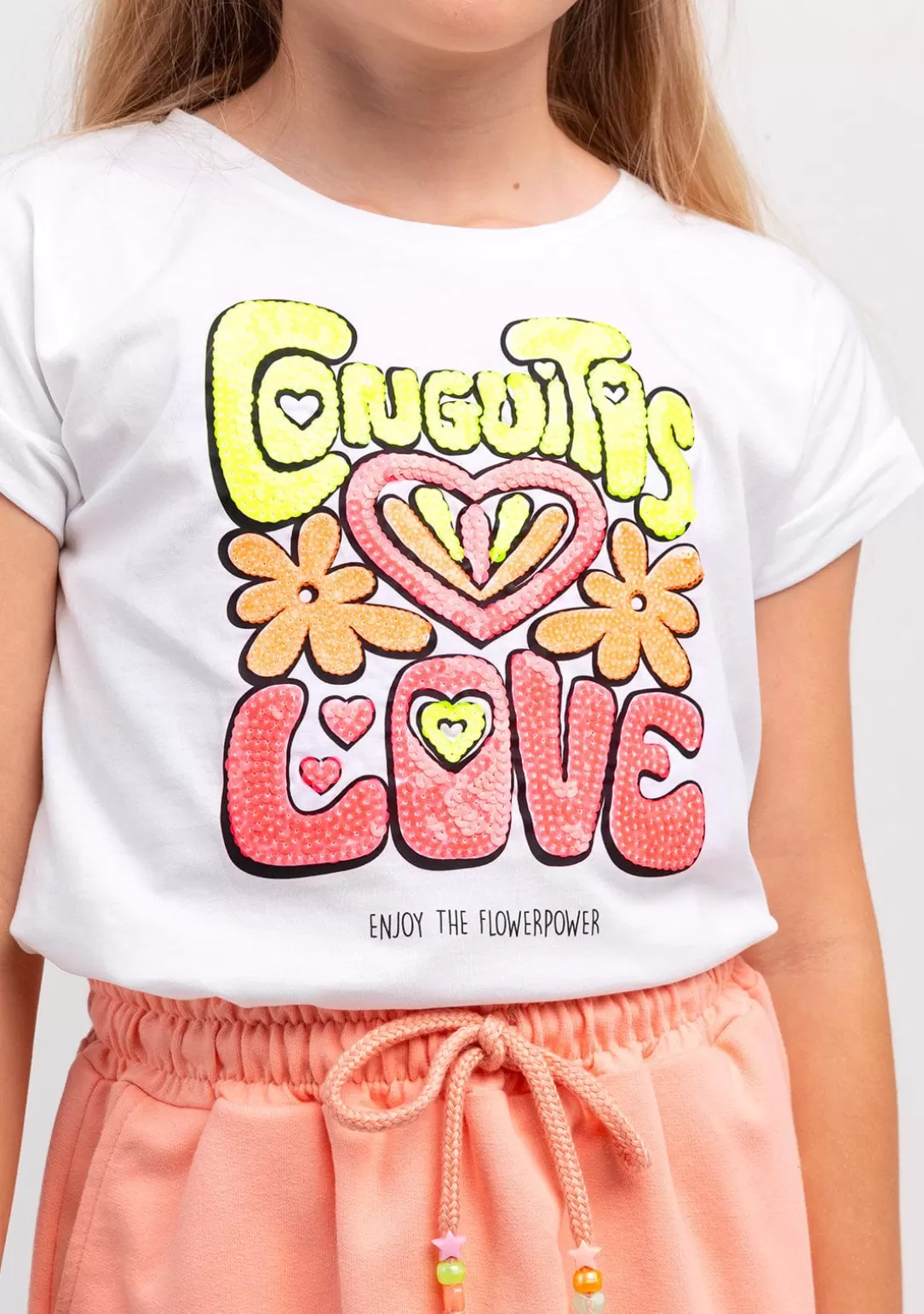 Nueva camiseta de manga corta para chica en color blanco. Lentejuelas flúor. Esta camiseta es un básico perfecto para el día a día que no puede faltar en el armario de tu hija. ¡Para amantes de los colores!