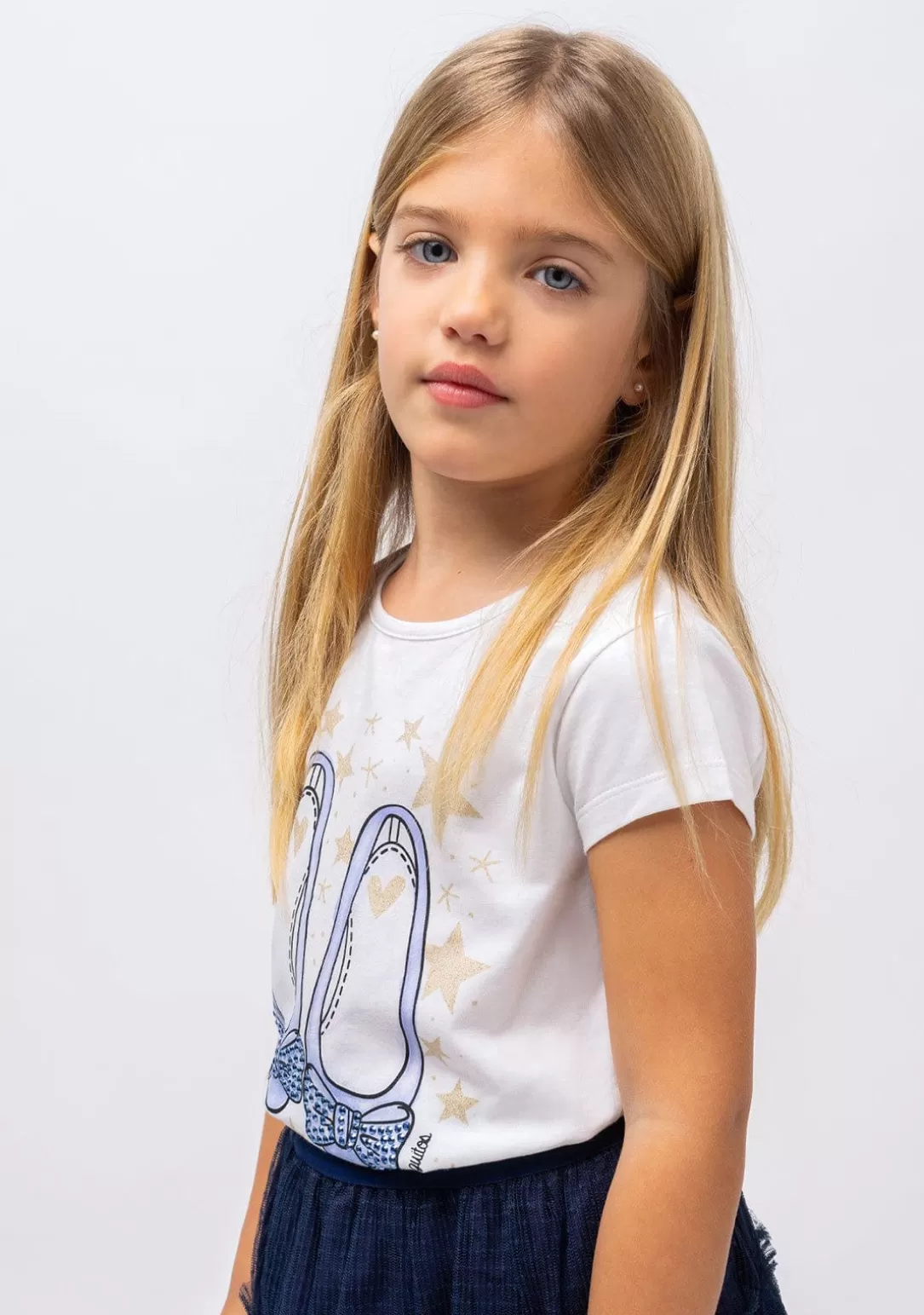 Camiseta de niña de color blanco confeccionada en algodón y spandex. Con diseño de bailarinas de color azul celeste con detalles de stras en el lazo. El dibujo está acompañado de estrellas y corazones en glitter de color dorado. Todo un básico ideal para esta época del año. También disponible el mismo diseño con las bailarinas en rosa.