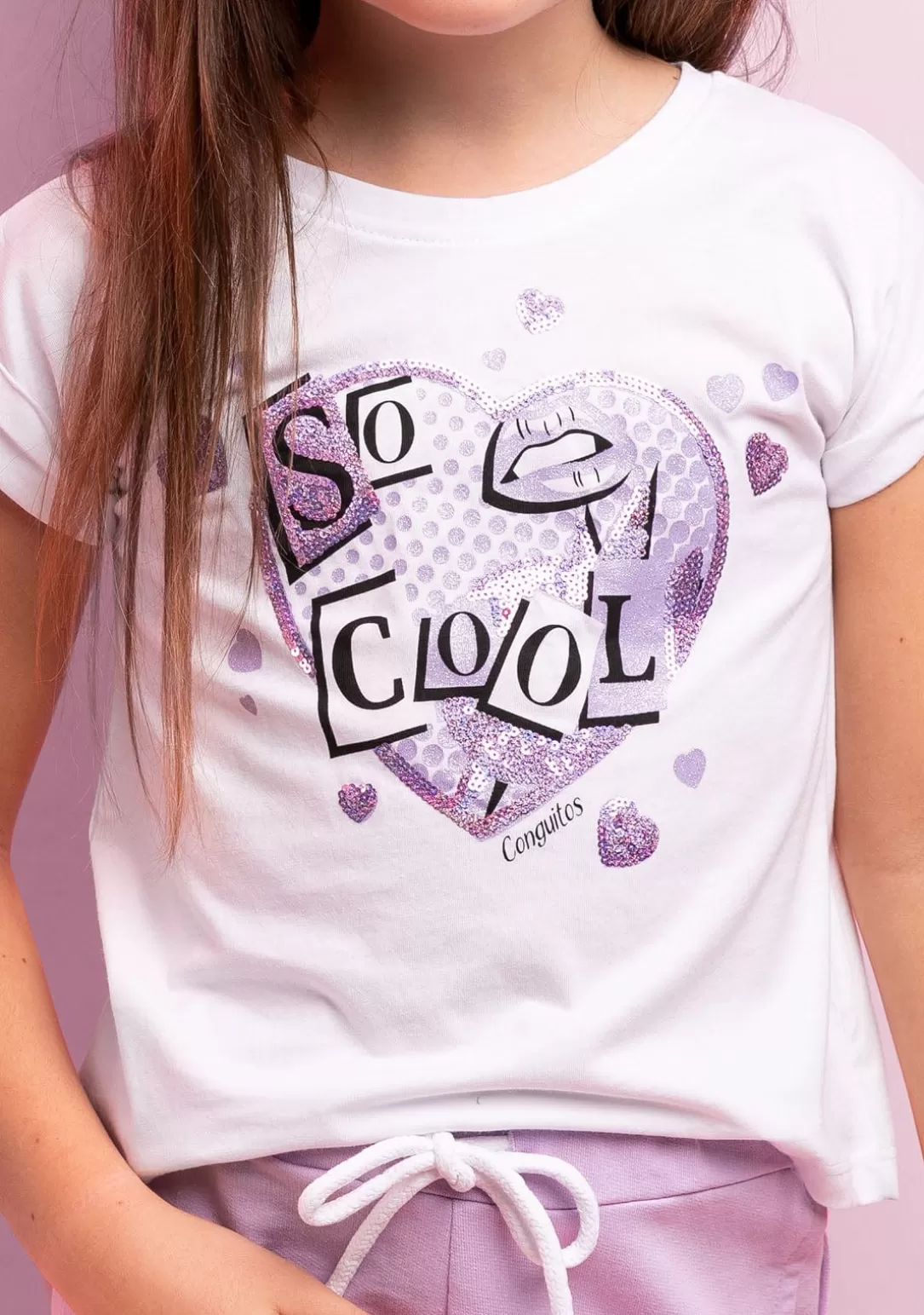 Camiseta de manga corta de niña en color blanco con diseño de corazón en color malva y lentejuelas. Una bonita camiseta con diseño original ideal para este verano.