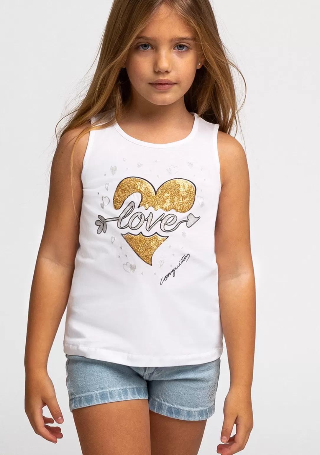 Camiseta de niña de tirantes con corazón bordado en lentejuelas de color doradas y la palabra love con glitter plata como una flecha que atraviesa el corazón. La camiseta es de color blanca y está fabricada en algodón. Un básico ideal para los días más calurosos de verano.