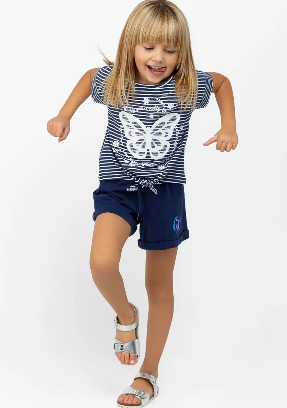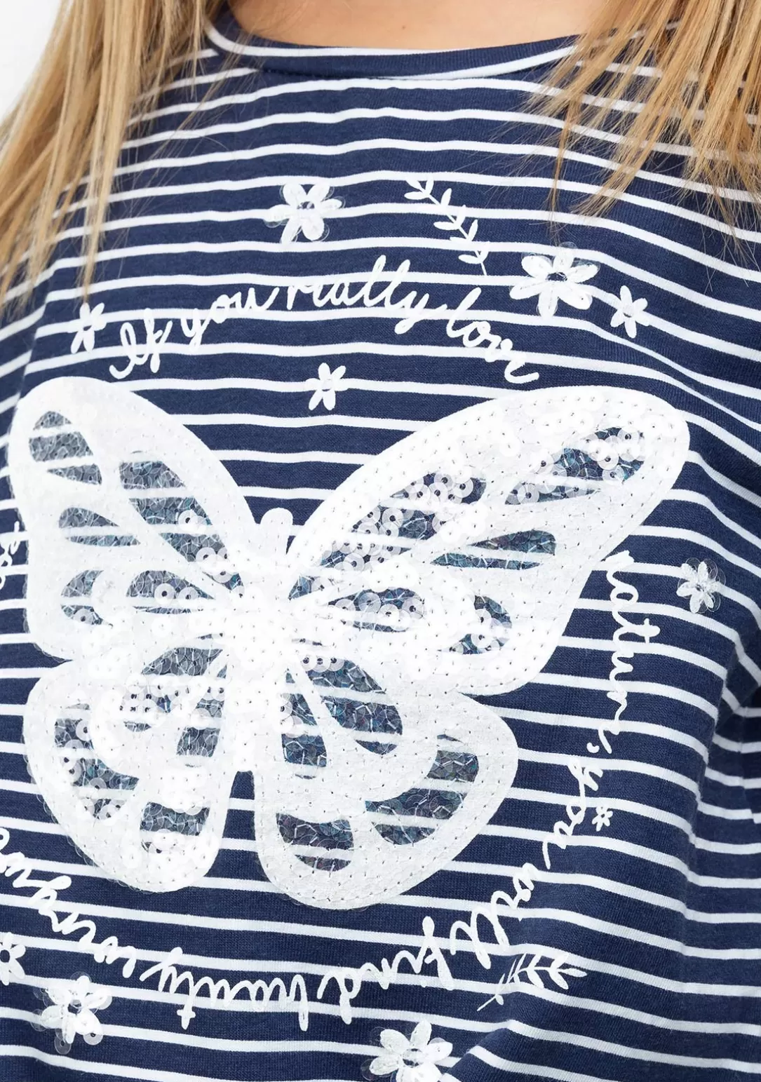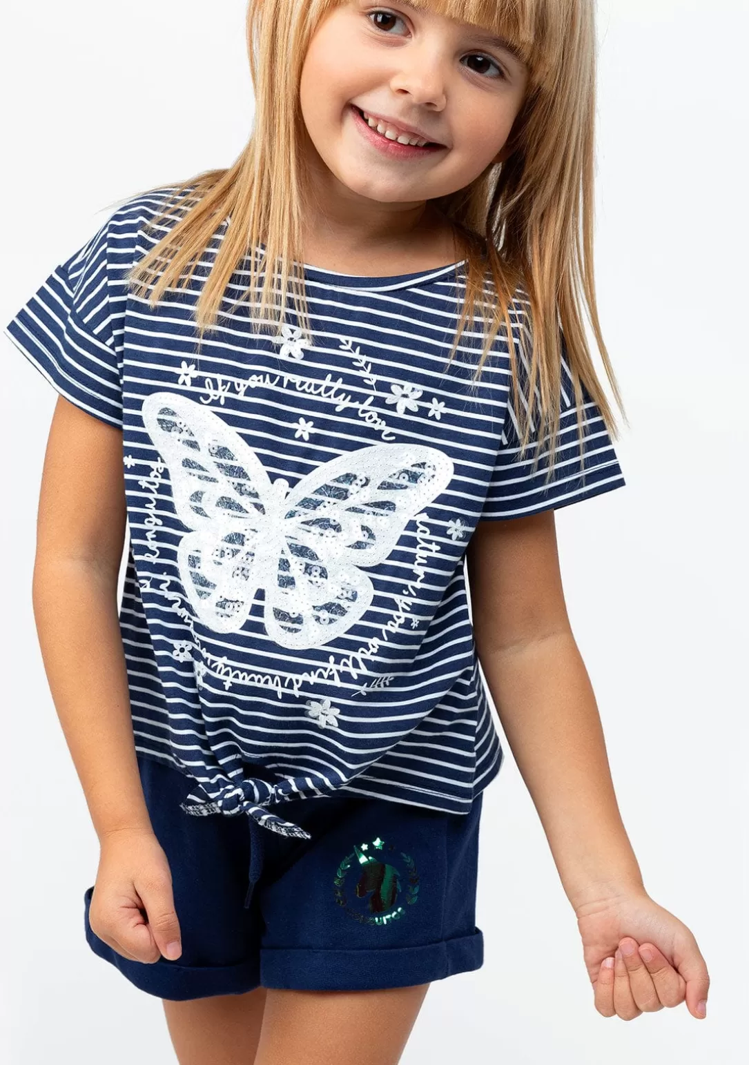 Nueva camiseta de manga corta y de color azul marino. Tiene estampado de rayas y dibujo de una mariposa con lentejuelas blancas. Además, tiene el detalle de un nudo en la parte inferior. La camiseta que le encantará a tu hija, ¡Una fantasía!