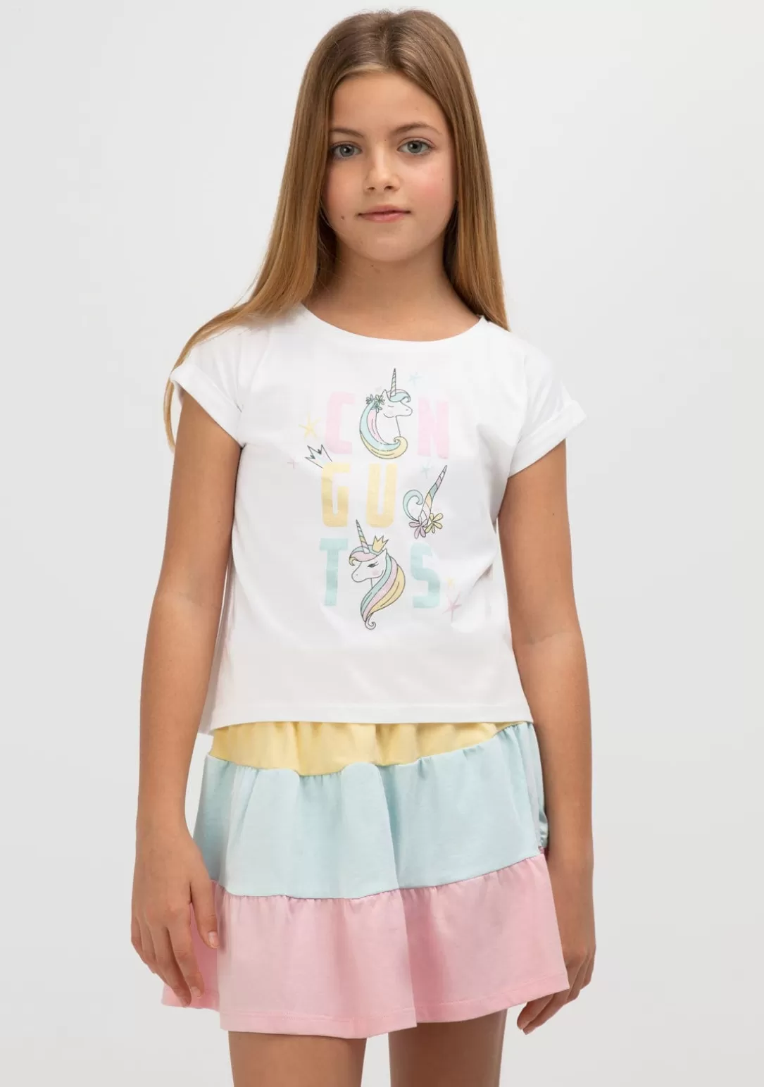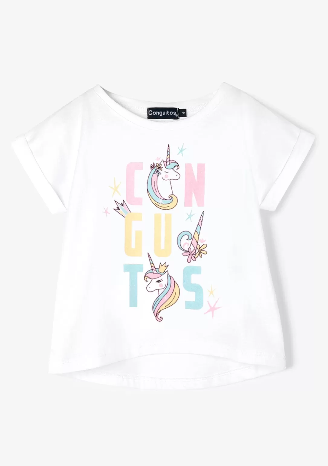 Este modelo de cuello redondo y manga recta cuenta con un estampado de conguitos multicolor con motivos de unicornios, corona y estrellas. ¡Perfecta para los peques!