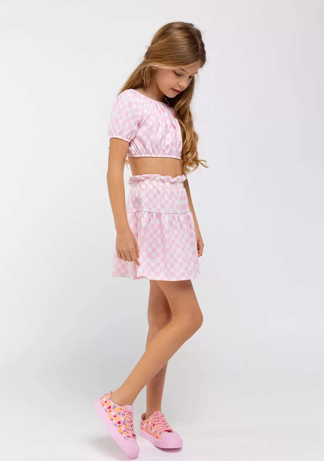 Nuevo top de manga corta en color rosa con estampado de cuadros. Tiene el detalle del logo de Conguitos en uno de los laterales. Perfecto para que las niñas vayan monas y fresquitas este verano.