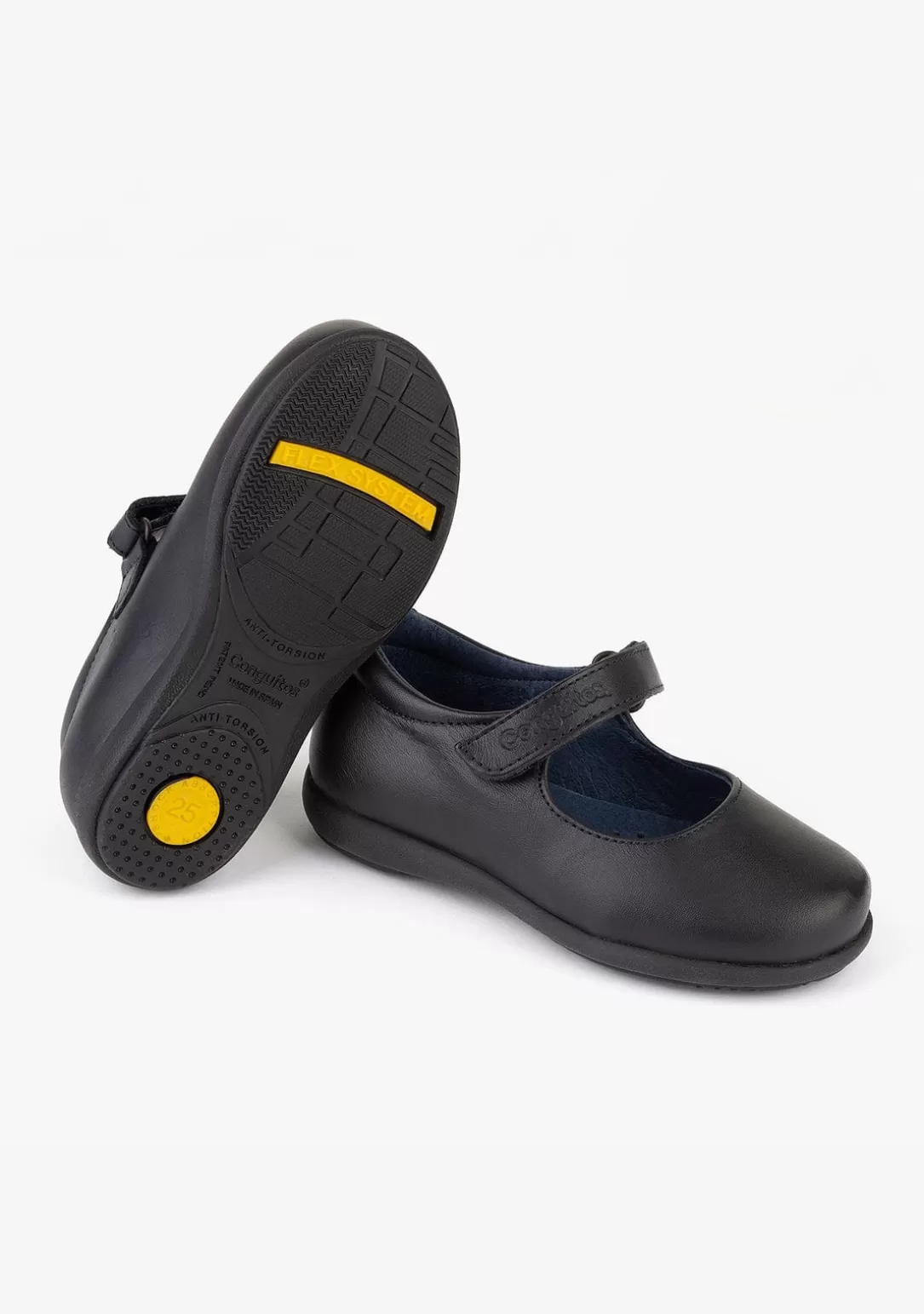Zapatos escolares de niña en piel, de color azul marino con suela de goma y tecnología GoFlex que proporciona comodidad al caminar. La tira de velcro proporciona al pie del niño una adaptación perfecta al zapato. Perfecto para la vuelta al cole, con la mejor calidad. Hecho en España.