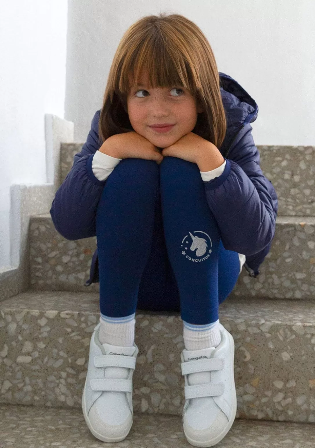 Leggings de niña de color azul marino fabricados en algodón con cintura elástica que facilita el ajuste y detalle en glitter de unicornio en la parte inferior del camal junto al logo de Conguitos. Para las amantes de los unicornios y la comodidad. Disponible en varios colores.