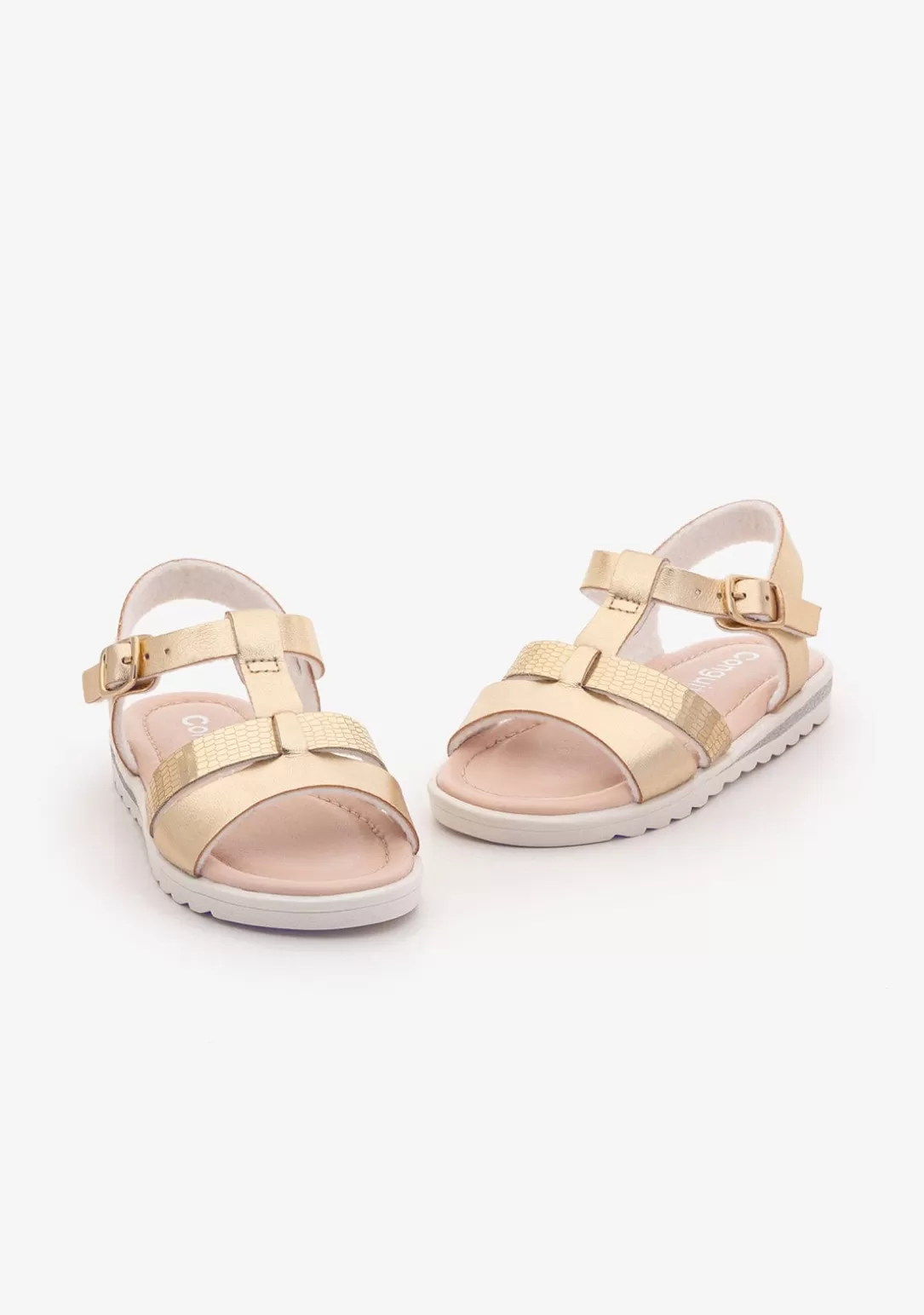 Sandalias de niña de color platino con acabado metalizado con detalle de tira que cruza el empeine. Dispone de tira trasera con hebilla para garantizar la mejor sujeción. Con suela dentada de goma que da un efecto deportivo y va decorada con una tira glitter plata.