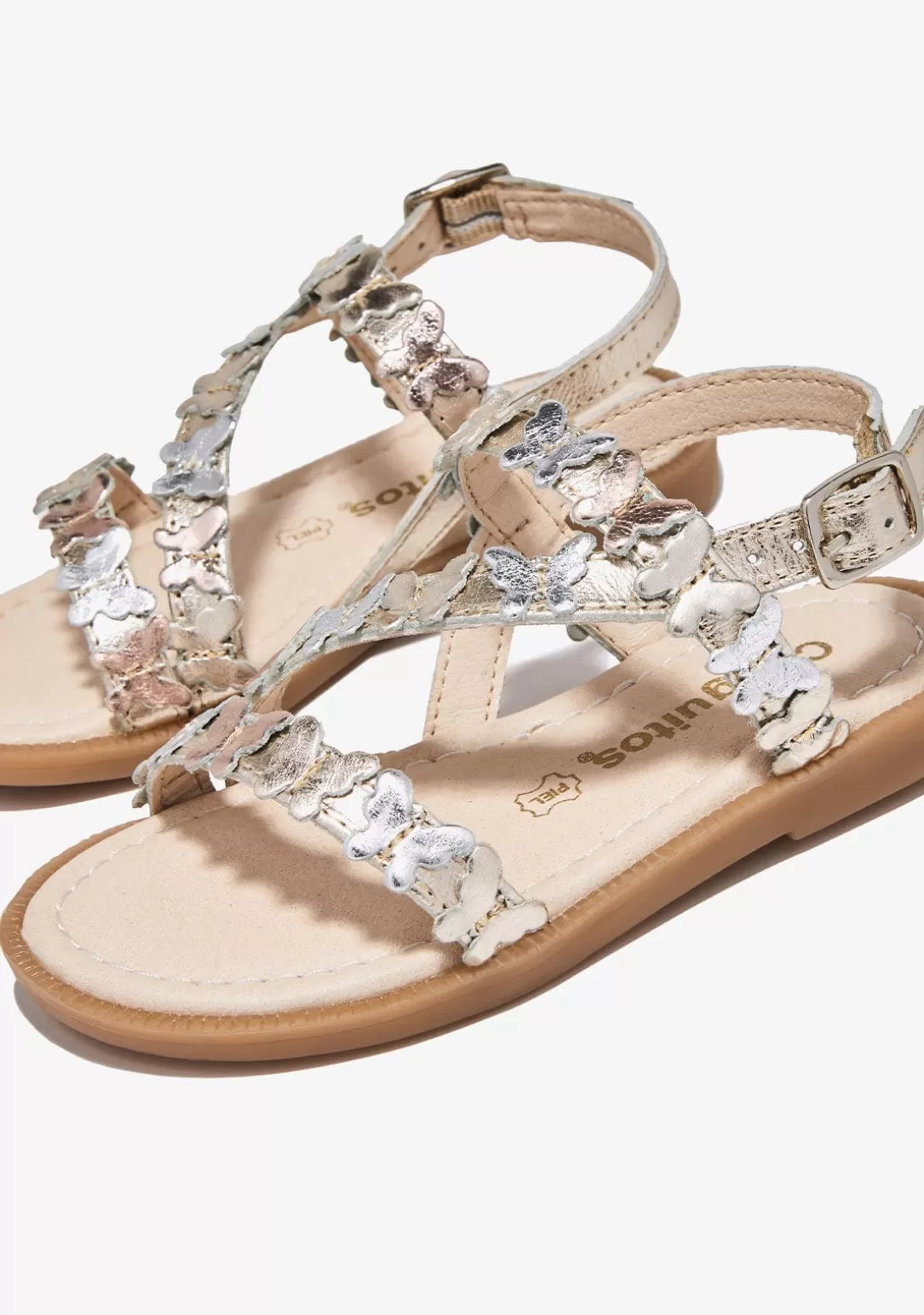 Este modelo de sandalias de piel plateadas está diseñado en napa. Tiene una tira con cierre de hebilla metálica. Las tiras están decoradas con mariposas en diferentes tonos.