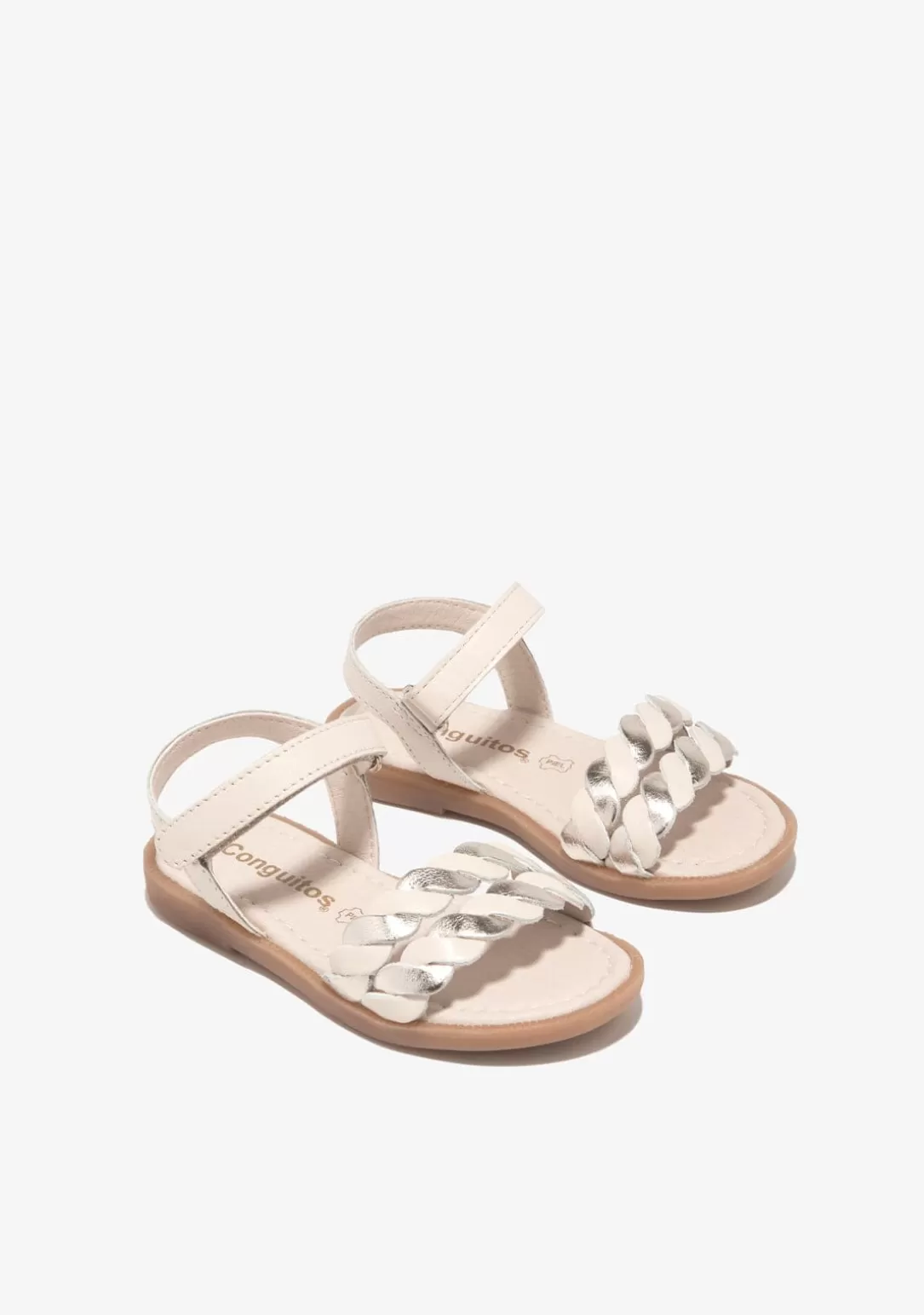 Este modelo de sandalias beige está diseñado en napa beige y metalizada. Tiene una tira con cierre adherente para mayor facilidad y tiras blancas y metalizadas en la parte delantera.