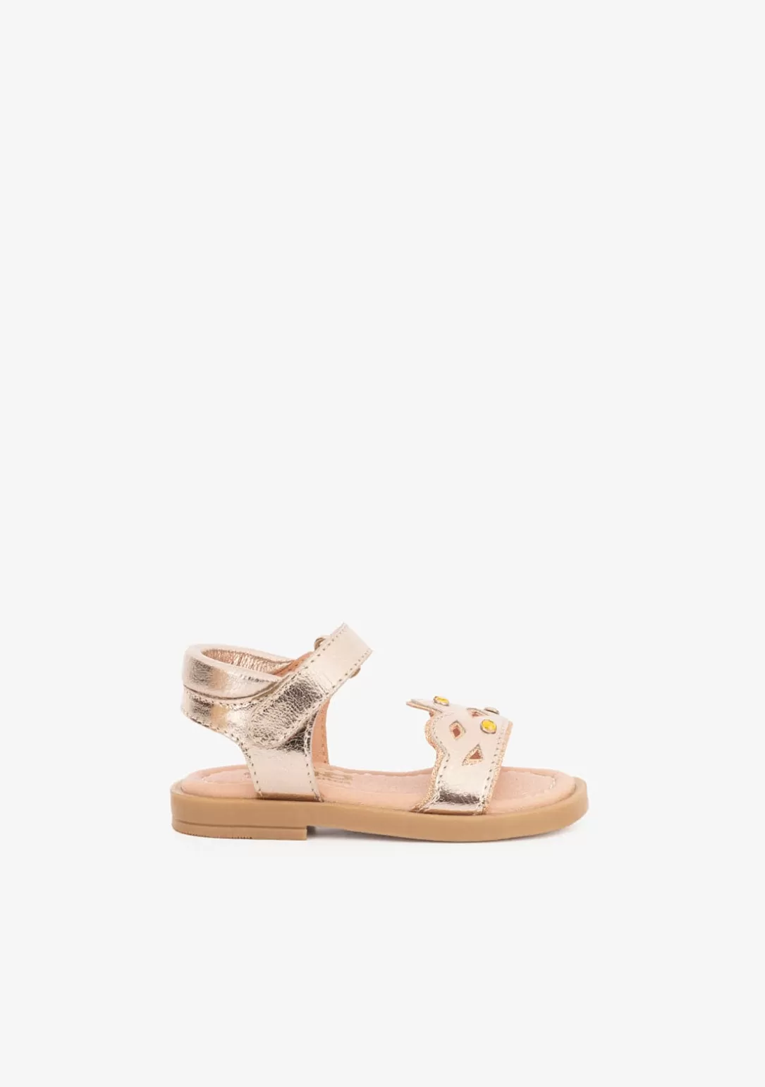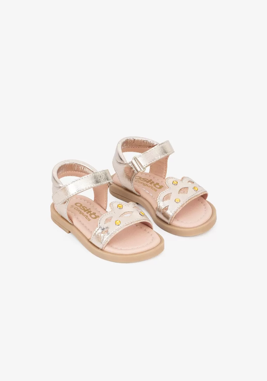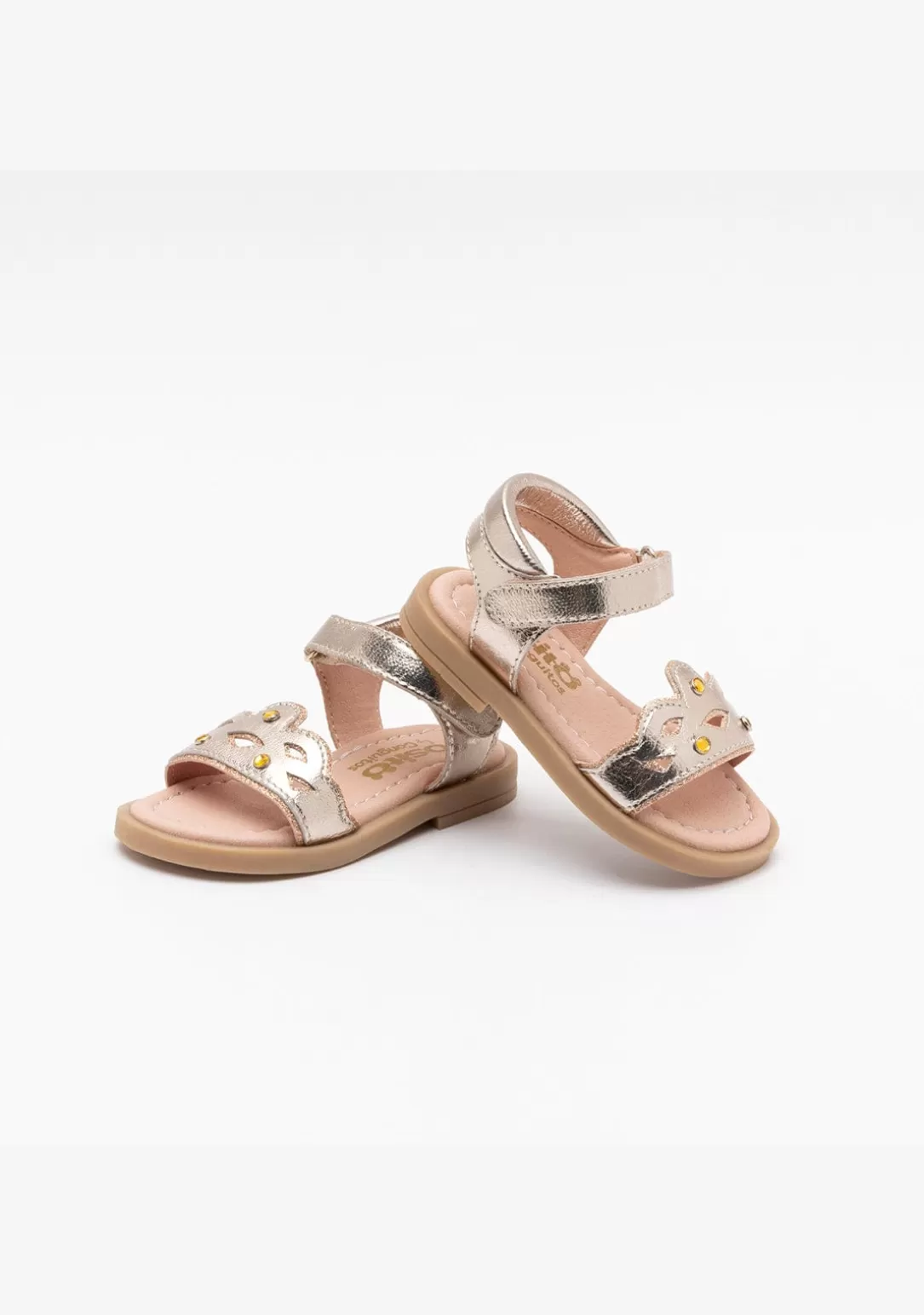 Sandalias para bebé confeccionadas en piel de color platino con detalle de corona en la zona frontal. La corona está troquelada, tiene detalles en glitter y pequeñas joyas. Están realizadas en piel, incluyendo el forro interior y planta, además lleva la zona del talón acolchado, consiguiendo mayor comodidad y ajuste al pie de bebé. Con la suela de goma flexible y cierre adhesivo. ¡Para las princesas más pequeñas!