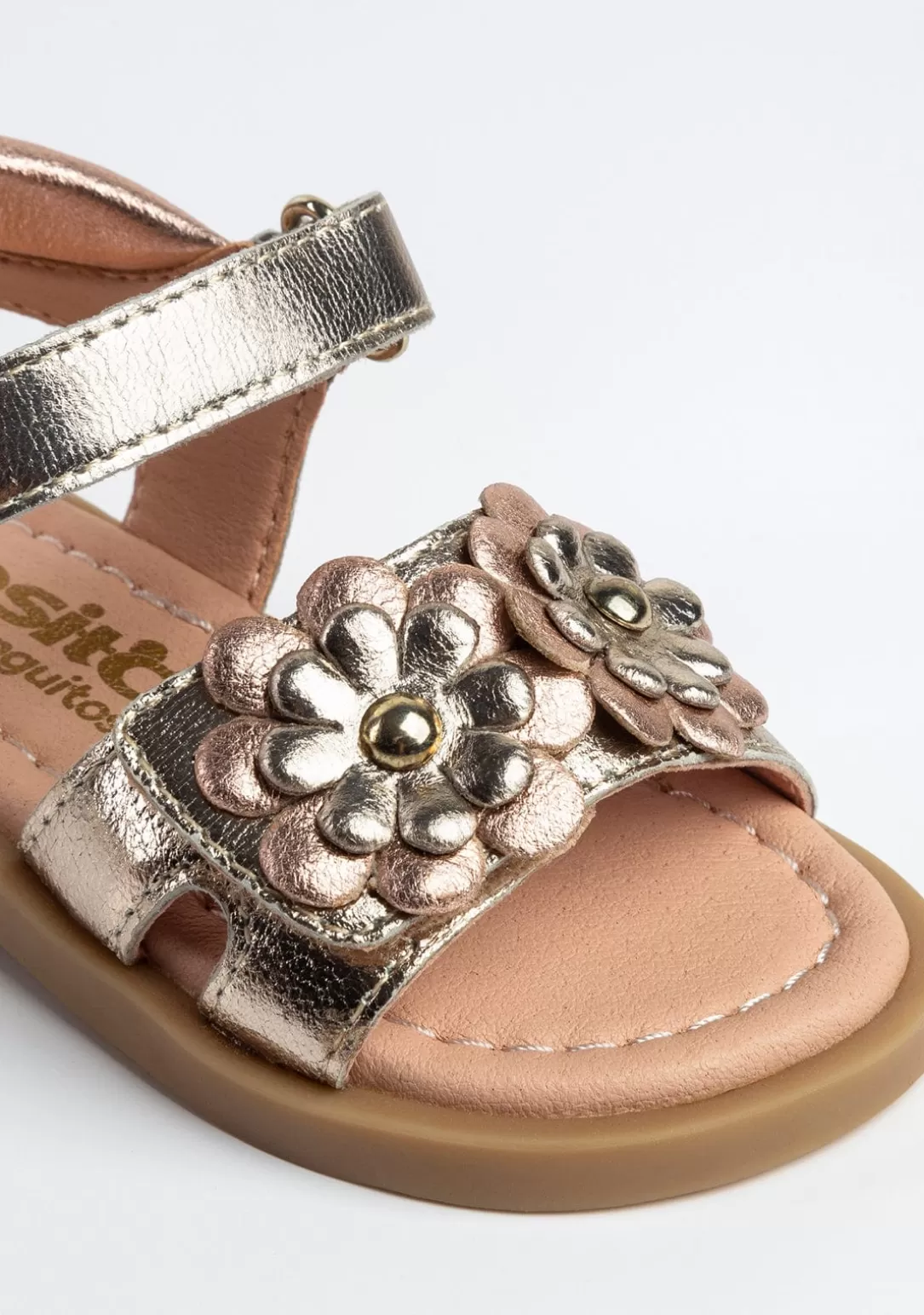 Sandalias para bebé confeccionadas en piel con acabado metalizado de colores platino y rosa magnesio, con doble cierre en adhesivo y detalles de flores combinadas en la zona frontal. Están realizadas en piel, incluyendo el forro interior y planta, además lleva la zona del talón acolchado, consiguiendo mayor comodidad y ajuste al pie de bebé. Con la suela de goma flexible.