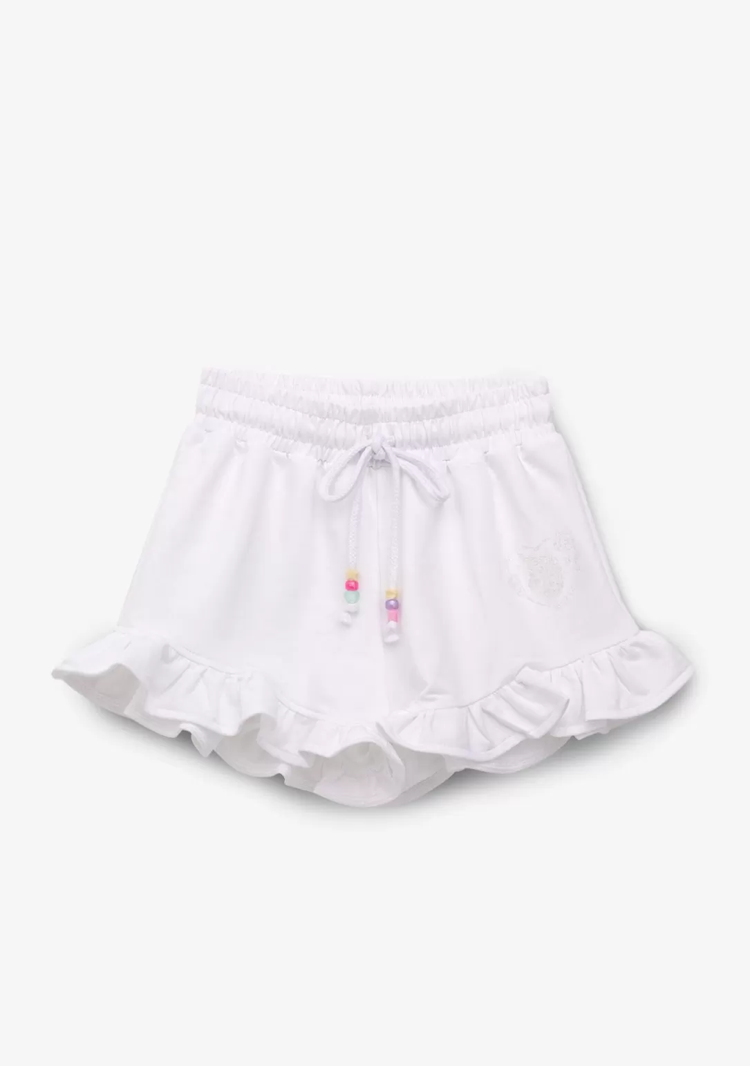 Pantalones cortos deportivos niña con purpurina detalle Unicornio en la parte delantera y abalorios en los cordones. Running pantalones cortos de felpa de algodón liso con cordones para un mejor ajuste y volantes de dobladillo en la parte inferior. Disponible en más colores.
