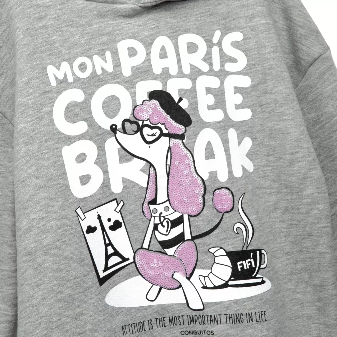 Sudadera de niña con capucha gris de algodón polar. Sus detalles como lentejuelas rosas. Esta sudadera tiene el interior afelpado y las mangas con acabado de puño para aislar mejor del frío.