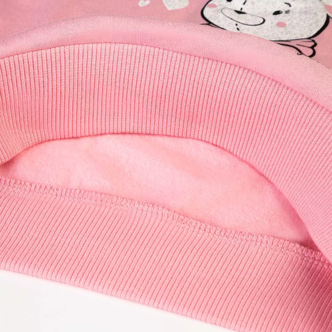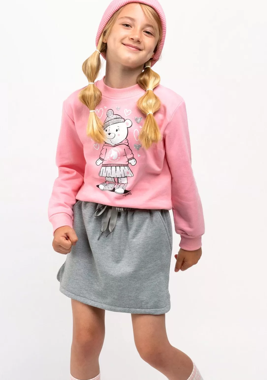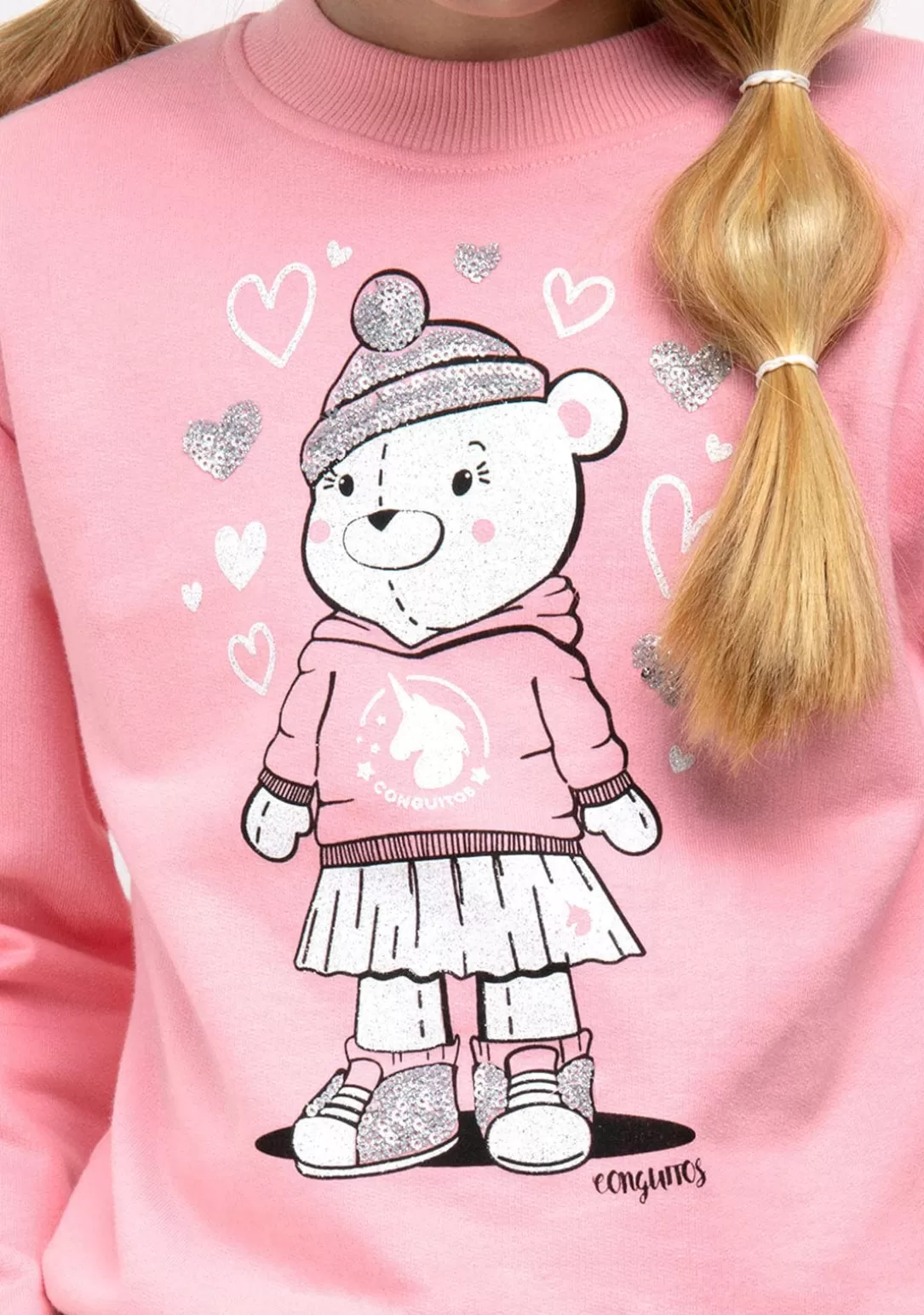 Sudadera de niña de color rosa fabricada en algodón con diseño original de osito de peluche con detalles como el gorrito o los zapatos rellenos de lentejuelas en color plata. Tiene el cuello redondo y mangas acabadas en puño, resultando la más cómoda y calentita de la temporada.