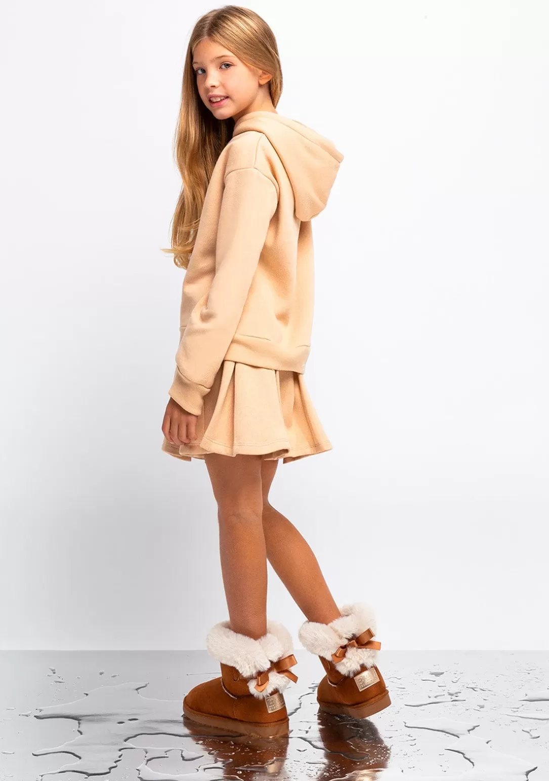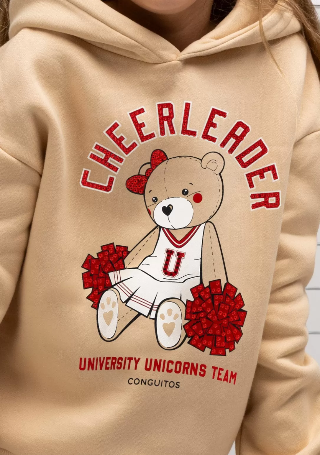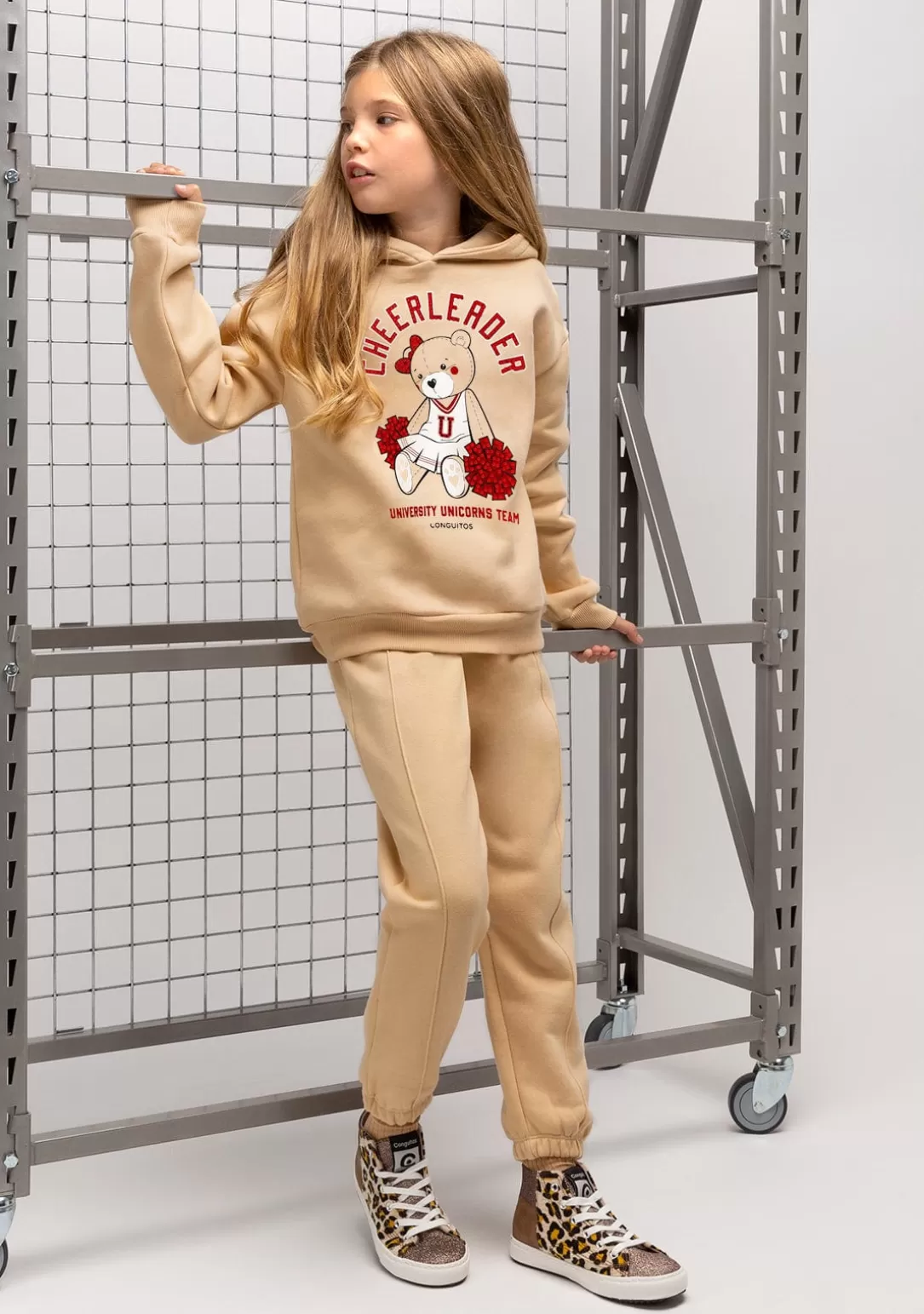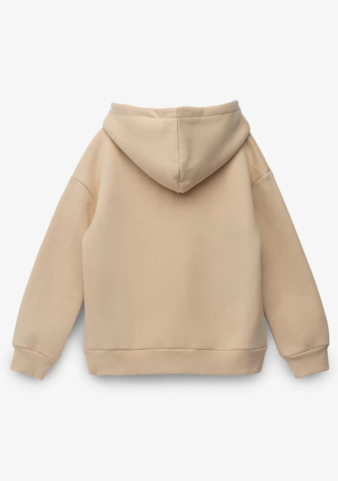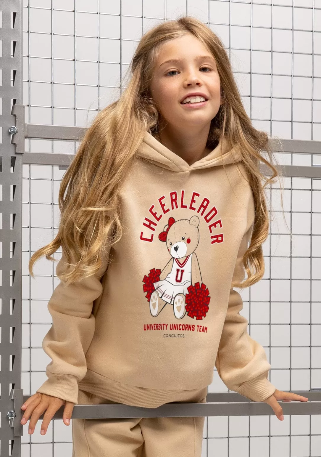 Sudadera de niña con capucha de color beige fabricada de algodón polar con diseño de osito. Sus detalles de lentejuelas rojas hacen que el osito sea colorido y único. Esta sudadera tiene el interior afelpado y las mangas con acabado de puño para aislar mejor del frío.