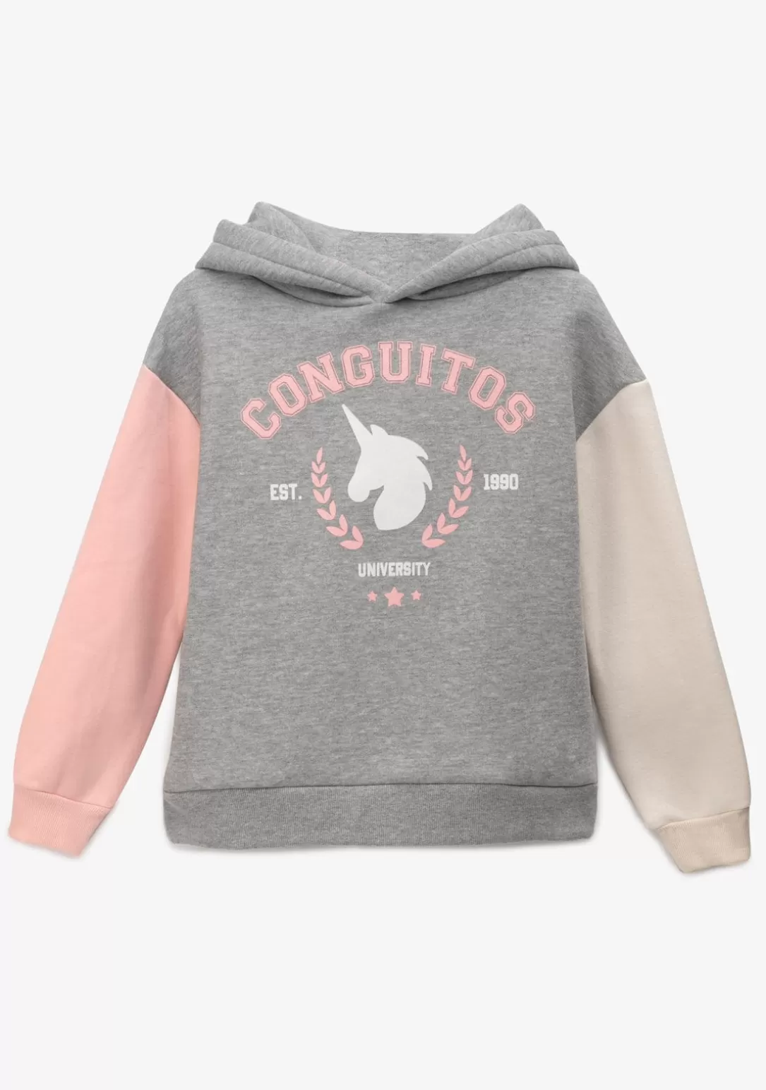 Sudadera con capucha para niña fabricada en algodón con cálido interior de felpa. Mangas rectas en color block con puños elásticos. Universidad diseño de estilo universitario con unicornio central en mosaico. Un estilo atemporal que no pasará desapercibido.