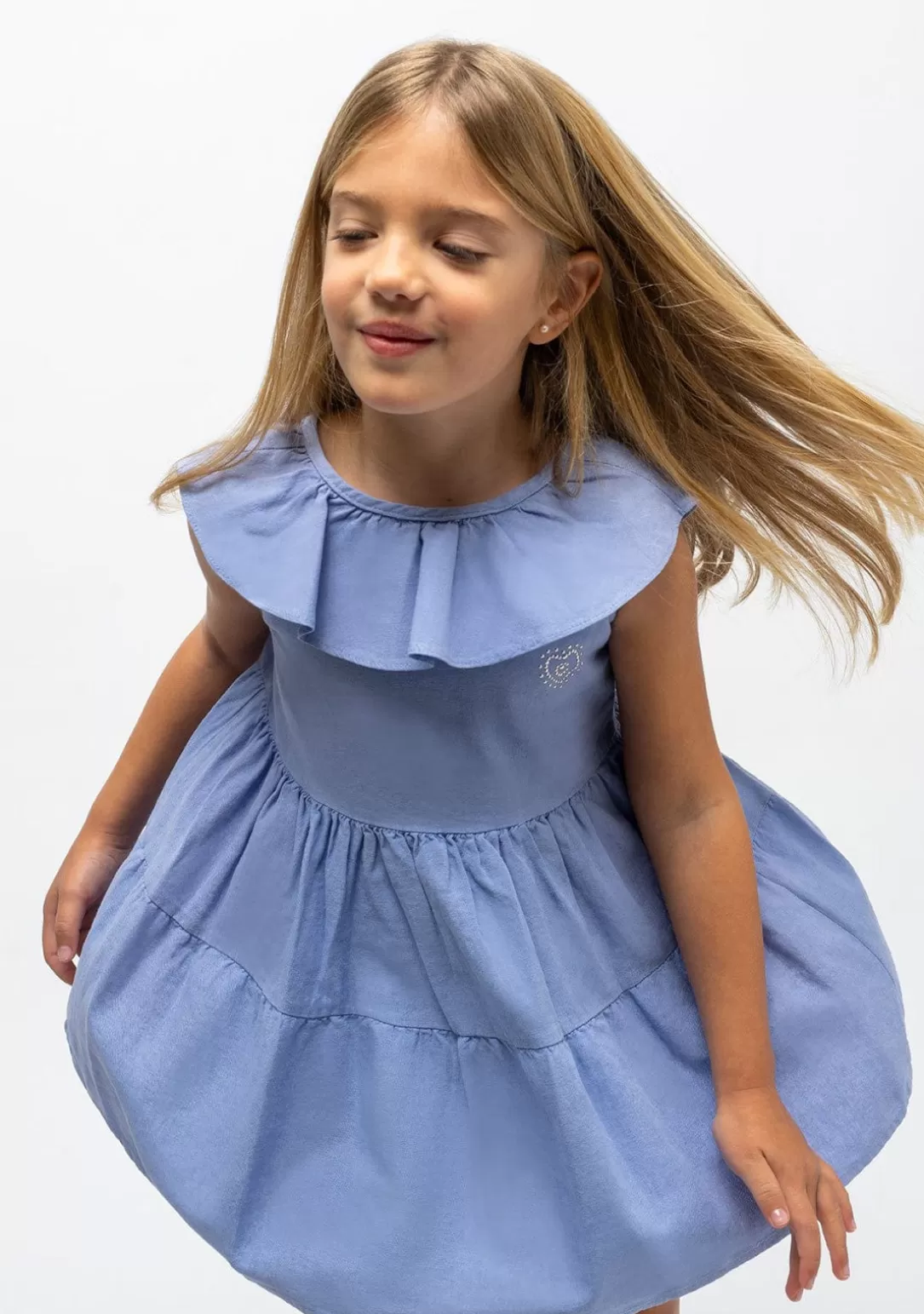 Vestido de niña de color azul celeste con volante en la parte superior, corte recto y falda con vuelo. Tiene el logotip…