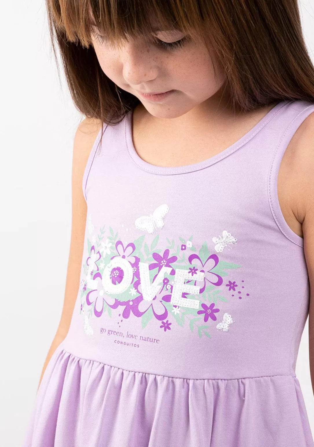 Vestido de niña en color malva con estampado «Love Nature» y volantes en el bajo. Este vestido sin tirantes está fabricado en algodón 100%, con cuello redondo y falda completa, un vestido cómodo y sencillo para los días de verano. También disponible en color blanco.