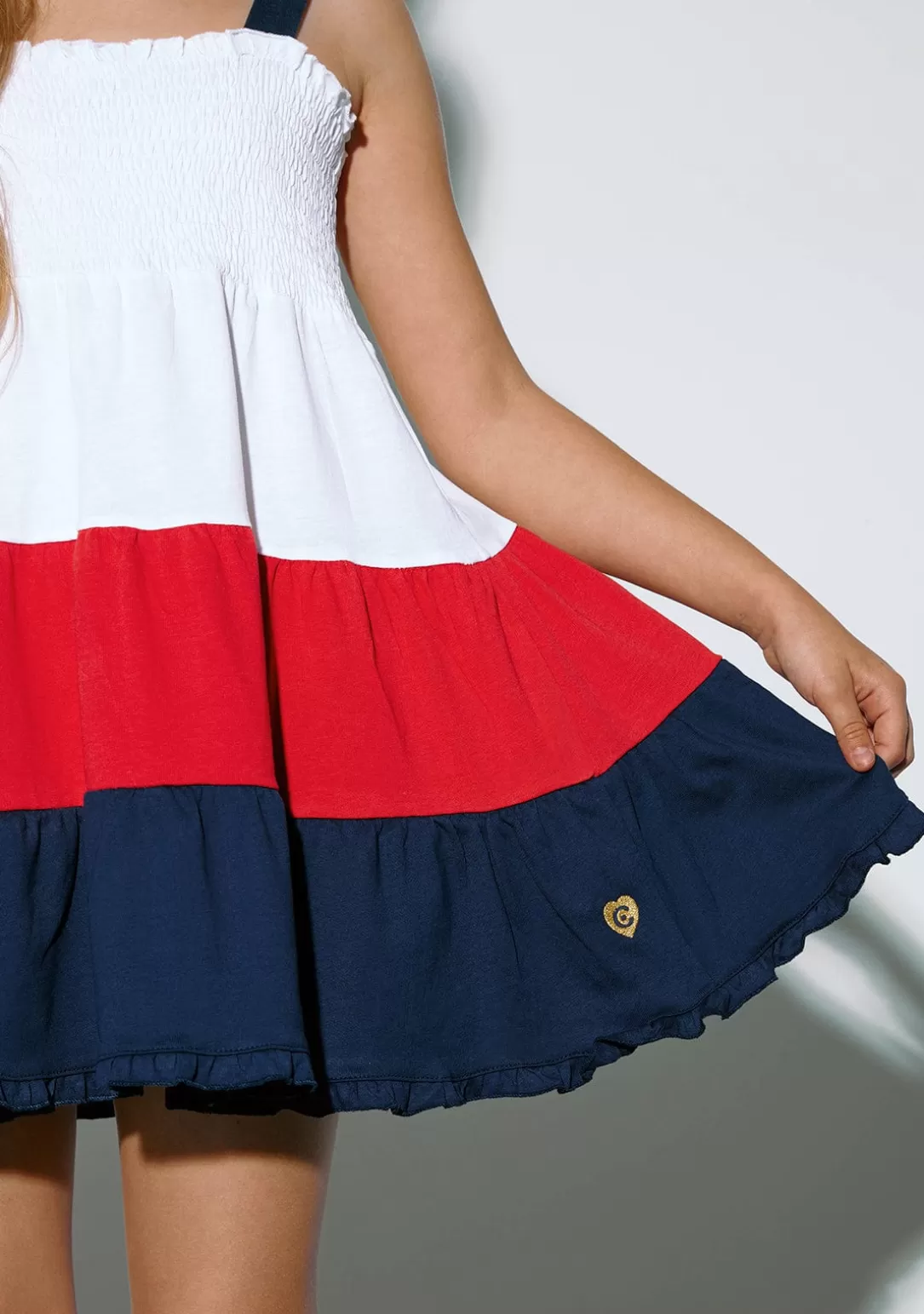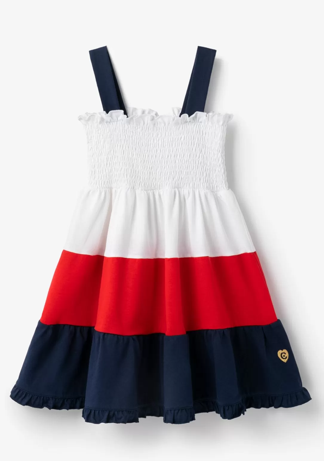 El vestido cuenta con tirantes anchos azul marino y nido de abeja en blanco. Tiene 3 volantes blanco, rojo y azul, que le dan el largo perfecto para la comodidad de los peques.