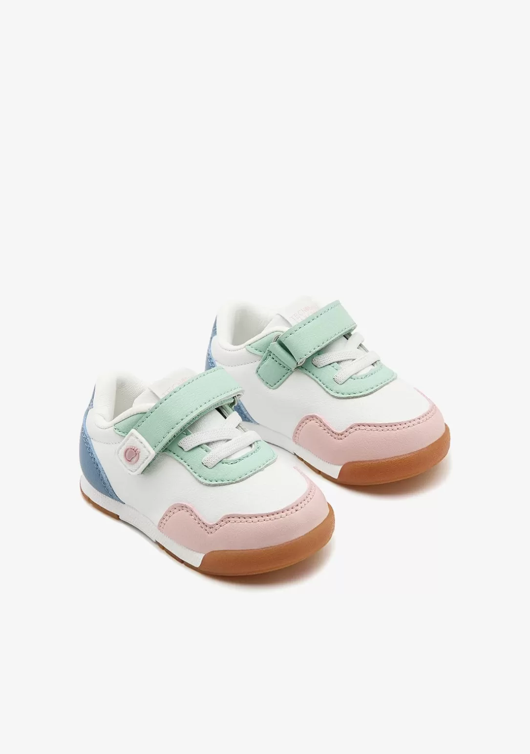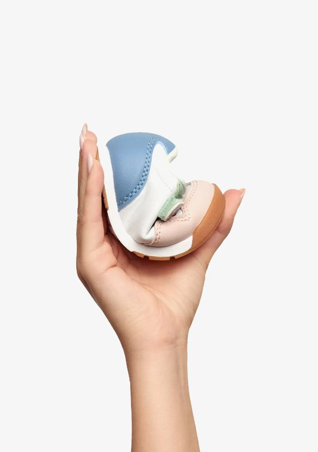 Calzado respetuoso rosa tipo sneaker para sus primeros pasos. Este diseño cumple con todos los requisitos podológicos: es ligero, flexible, con puntera ancha y con una suela cero drop que mantiene la misma altura desde el talón hasta la puntera. Estas características facilitan el andar con libertad, generando así el efecto descalzo o «barefoot».