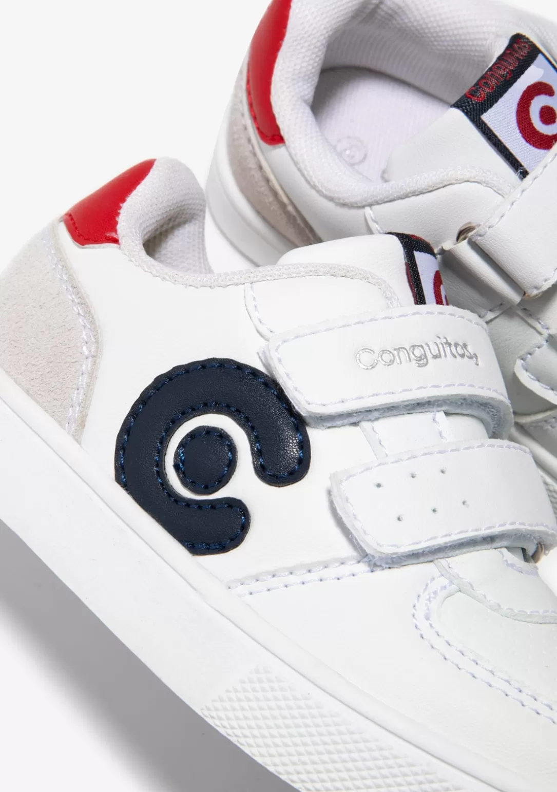 Este diseño combina la napa blanca con un detalle rojo en el talón. Se ajustan con tiras adhesivas, lo que facilita el ponerlas y quitarlas, perfecto para el día a día.