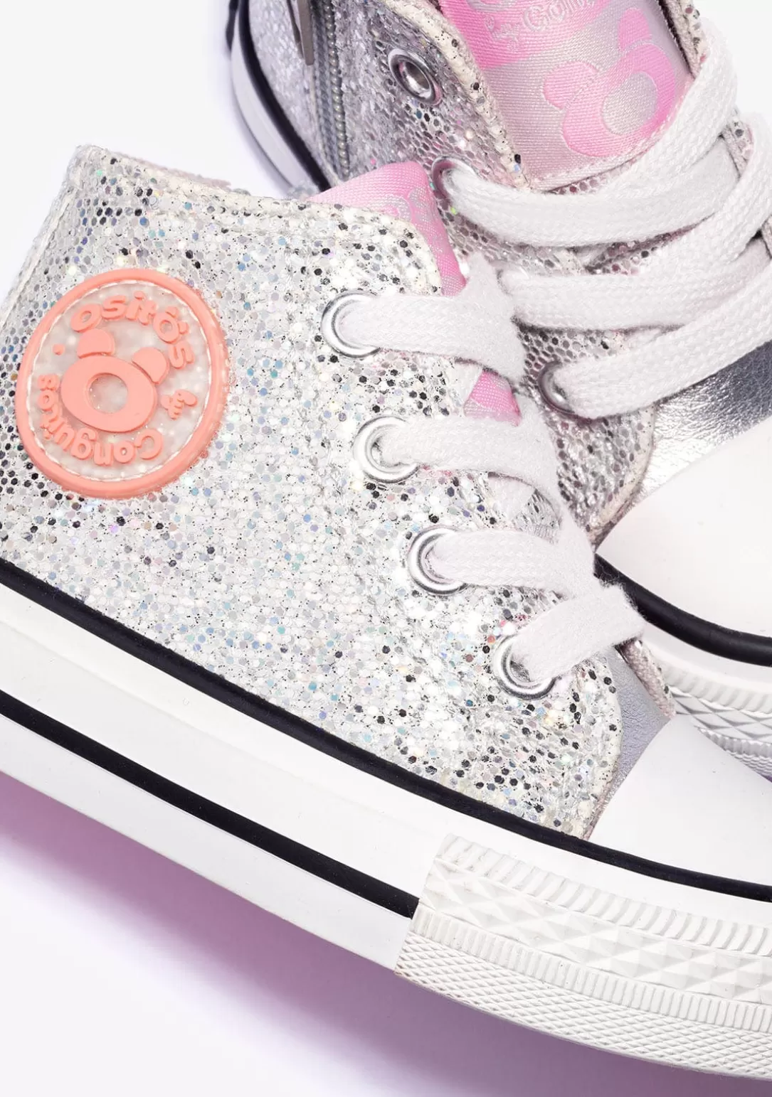 Sneakers altas confeccionadas en material glitter. Cordones ajustables de algodón. Cremallera en el lateral interno para facilitar su puesta. Puntera reforzada y suela de goma. Logo de Osito en la parte externa de la zapatilla. Comodidad y estilo para brillar a cada paso.