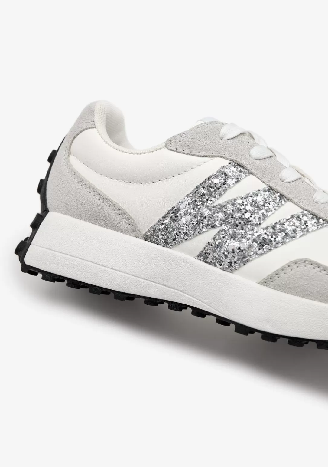 Este modelo está confeccionado con textil y presenta un acabado en gris y blanco. Además, cuenta con el detalle en glitter en la letra W de su lateral y el logo en la parte del talón. Su cierre de cordones permite un ajuste perfecto y gran comodidad.