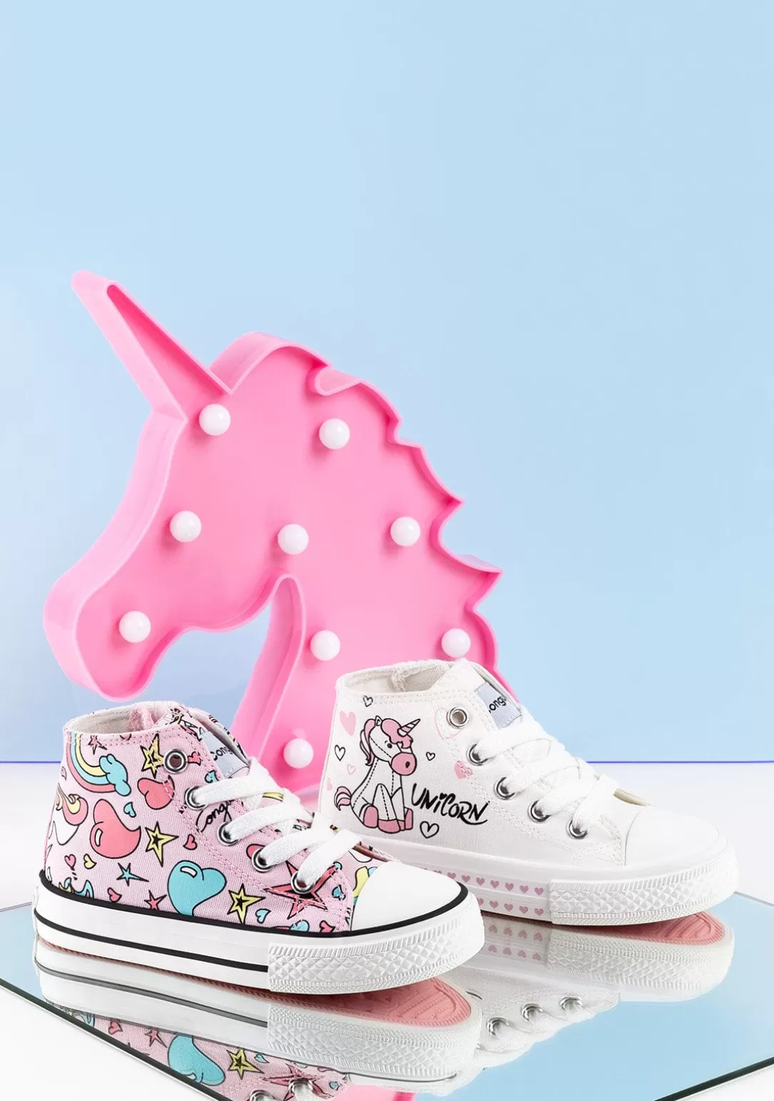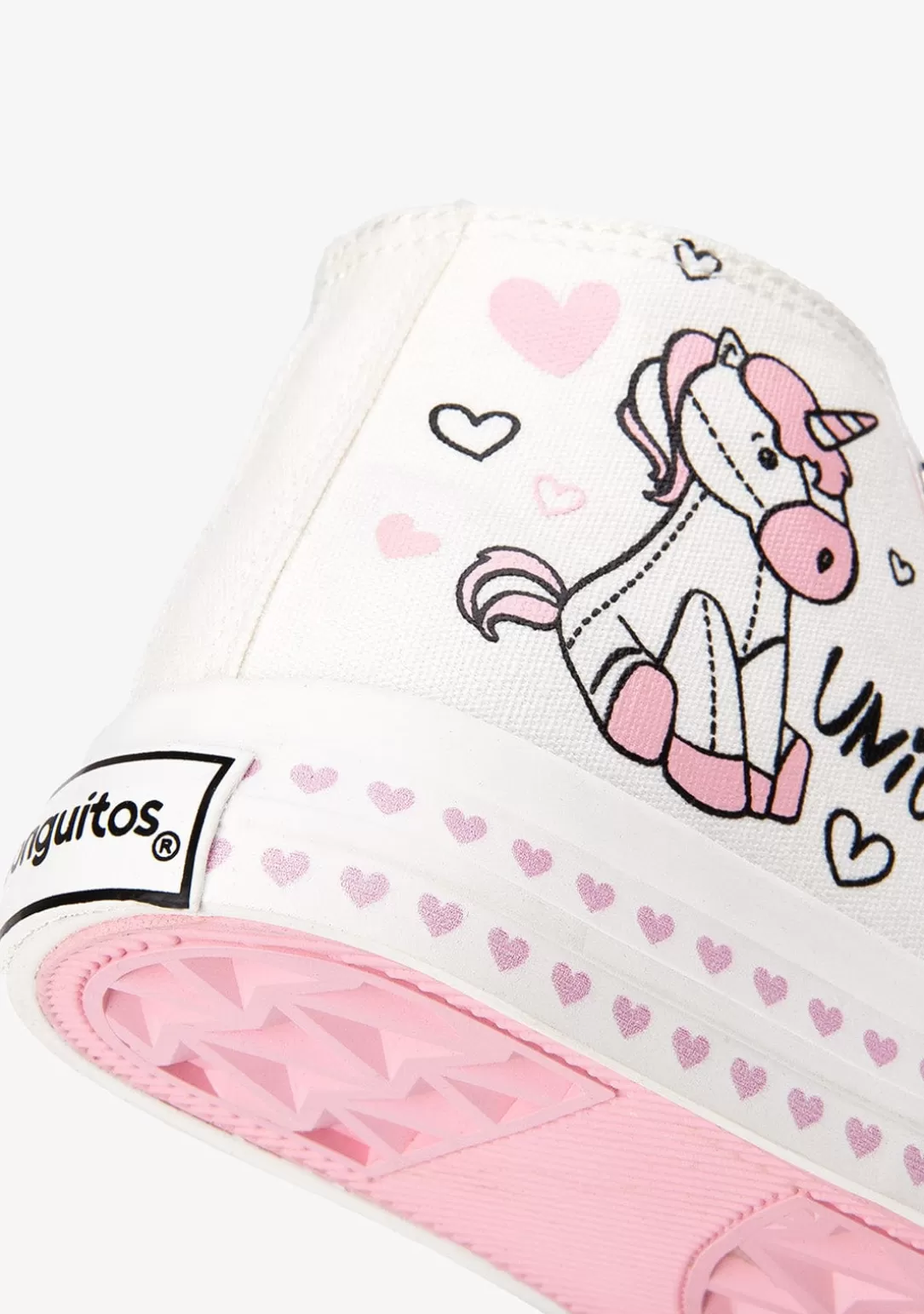 Zapatillas altas de lona con cordones. Tiene detalle de cordón y cremallera en el lateral de la bota. Suela de goma que garantiza la flexibilidad y puntera reforzada para una mayor protección de los dedos. Estas nuevas zapatillas blancas tienen un unicornio con detalles en rosa en un lateral y suela de corazoncitos rosas. Un básico para el día a día que no puede faltar en el armario de tu niña.