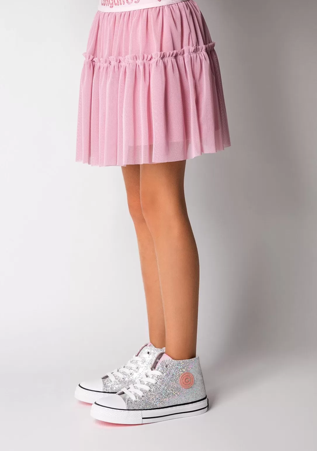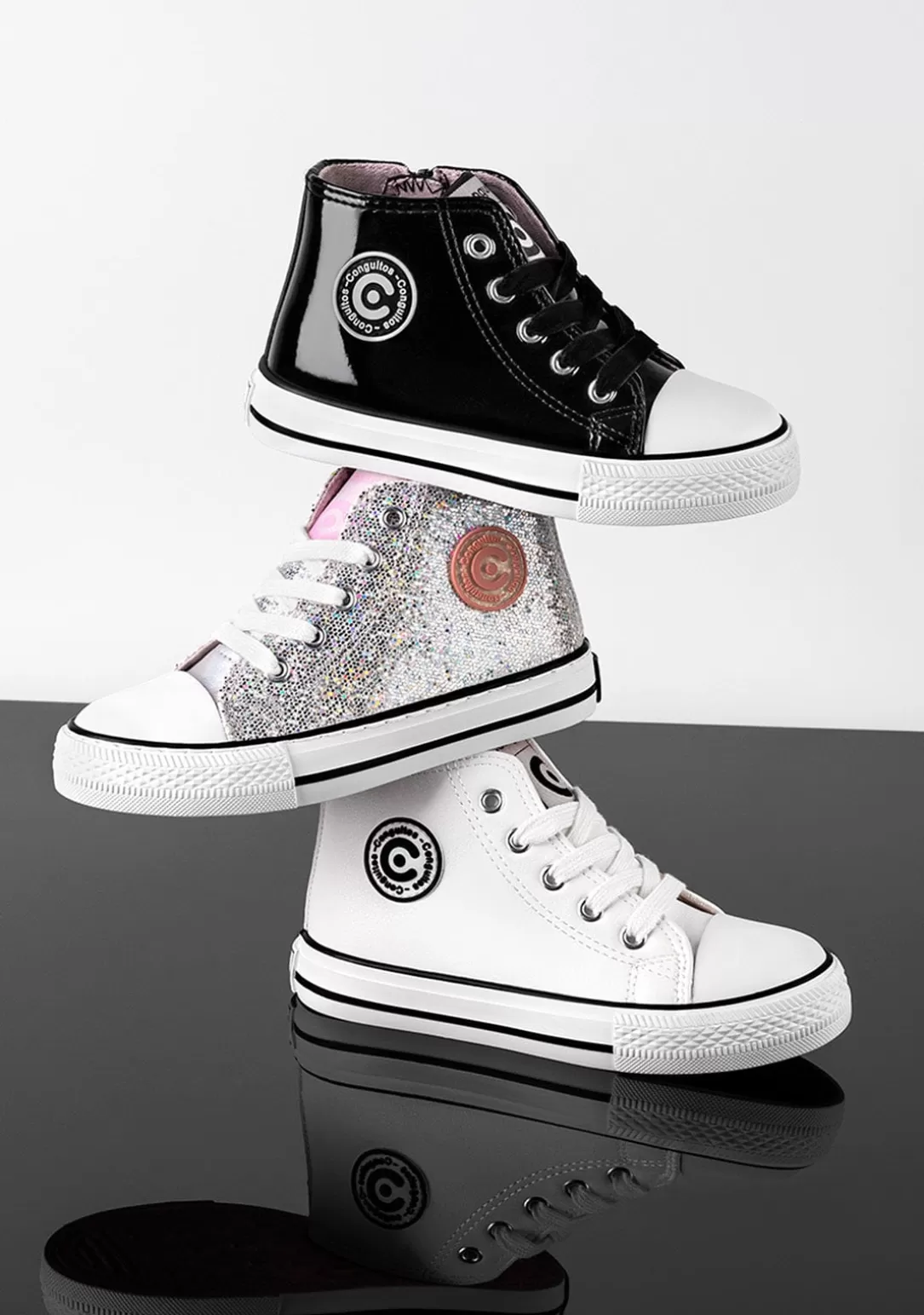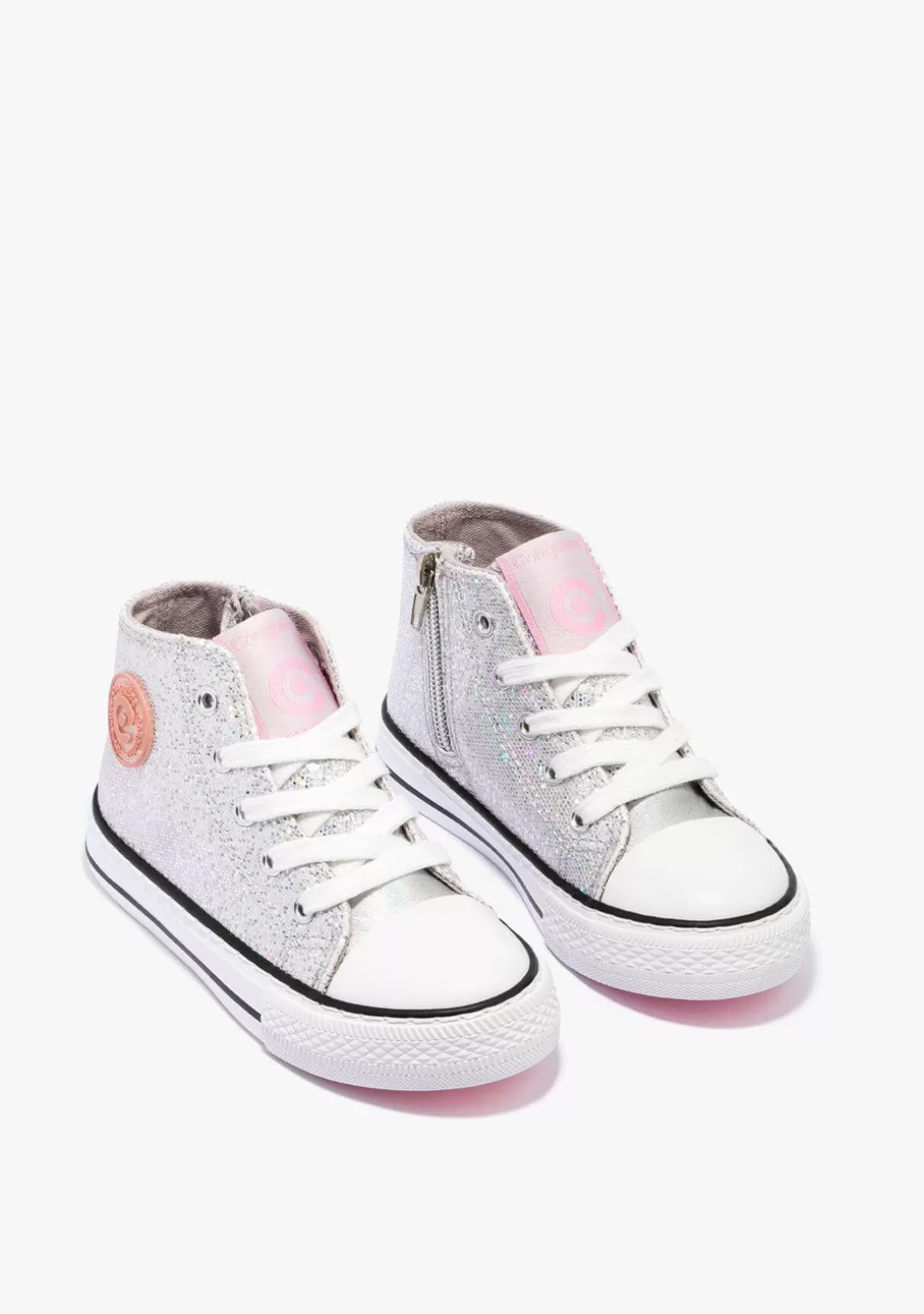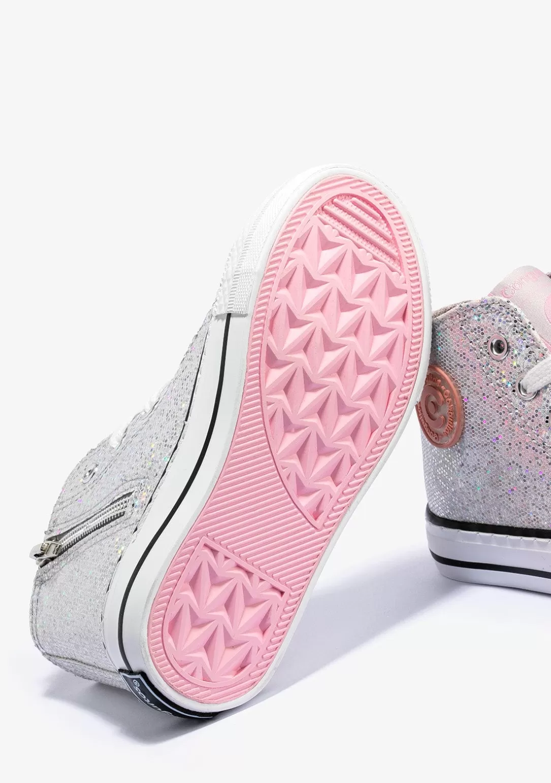 Sneakers altas confeccionadas en material glitter. Cordones ajustables de algodón. Cremallera en el lateral interno para facilitar su puesta. Puntera reforzada y suela de goma. Logo de Conguitos en la parte externa de la zapatilla. Comodidad y estilo para brillar a cada paso.