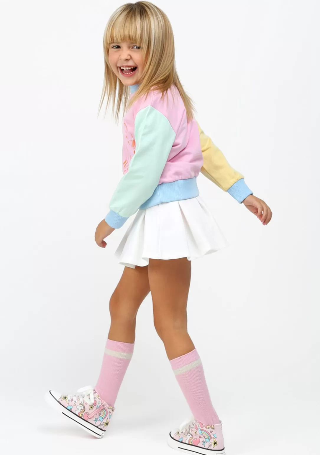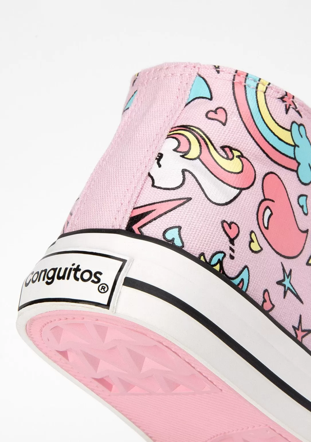 Las nuevas zapatillas altas de lona en color rosa con cordones. Tienen detalles de cordón y cremallera en el lateral de la bota. Suela de goma que garantiza la flexibilidad y puntera reforzada para una mayor protección de los dedos. En estas zapatillas se pueden ver unicornios, corazones, estrellas y arco iris, la combinación perfecta.