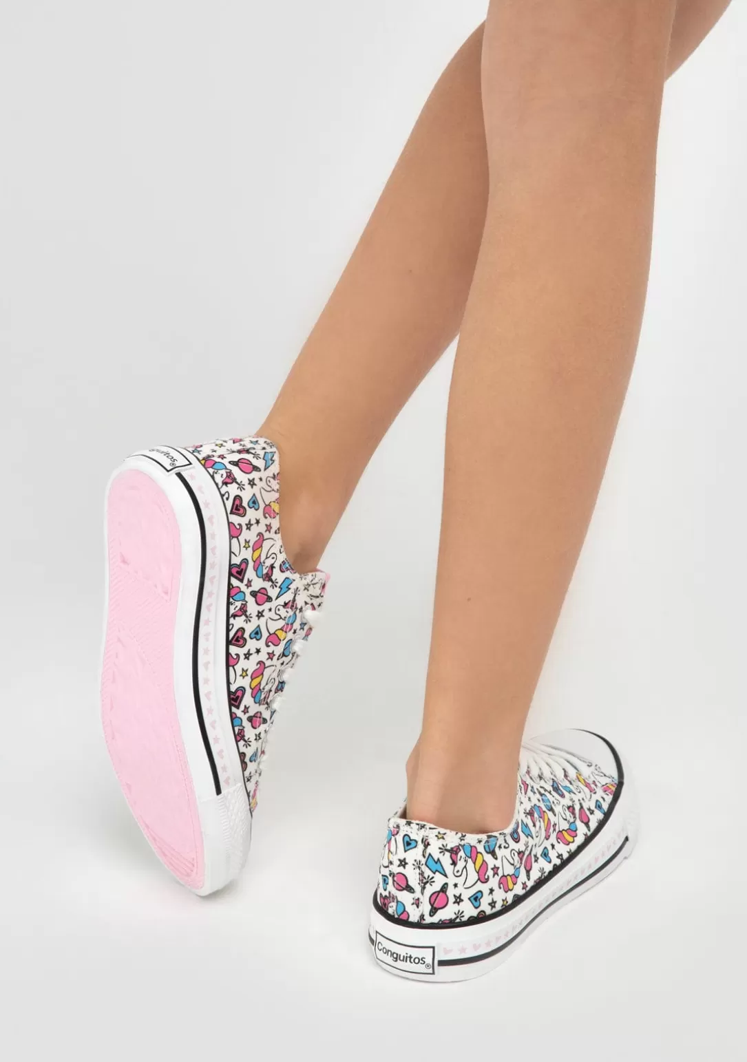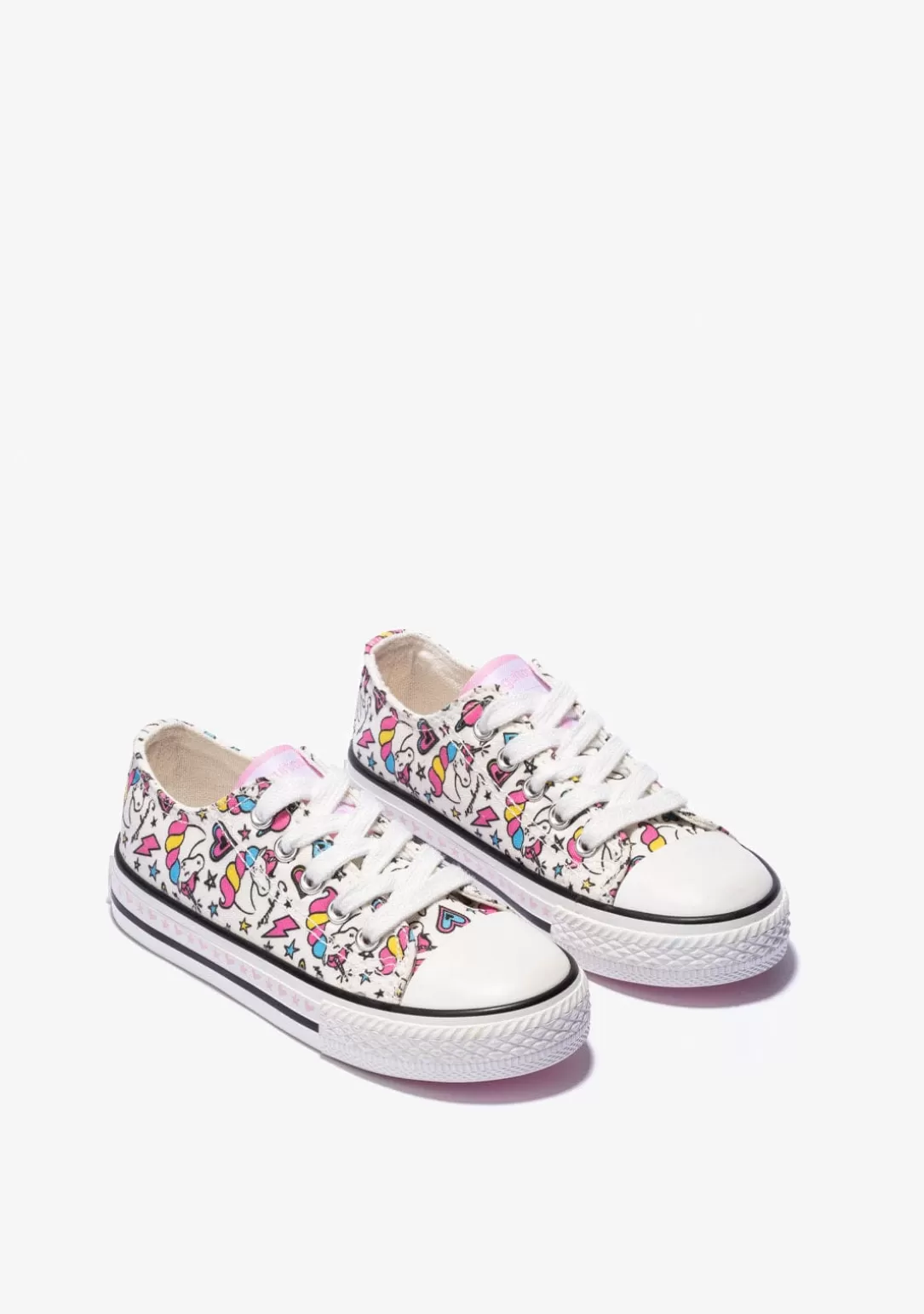 Estas zapatillas de lona tienen suela de goma, cierre de cordones y puntera reforzada, para garantizar la comodidad a cada paso de los más pequeños de la casa. Estampado de unicornio multicolor.