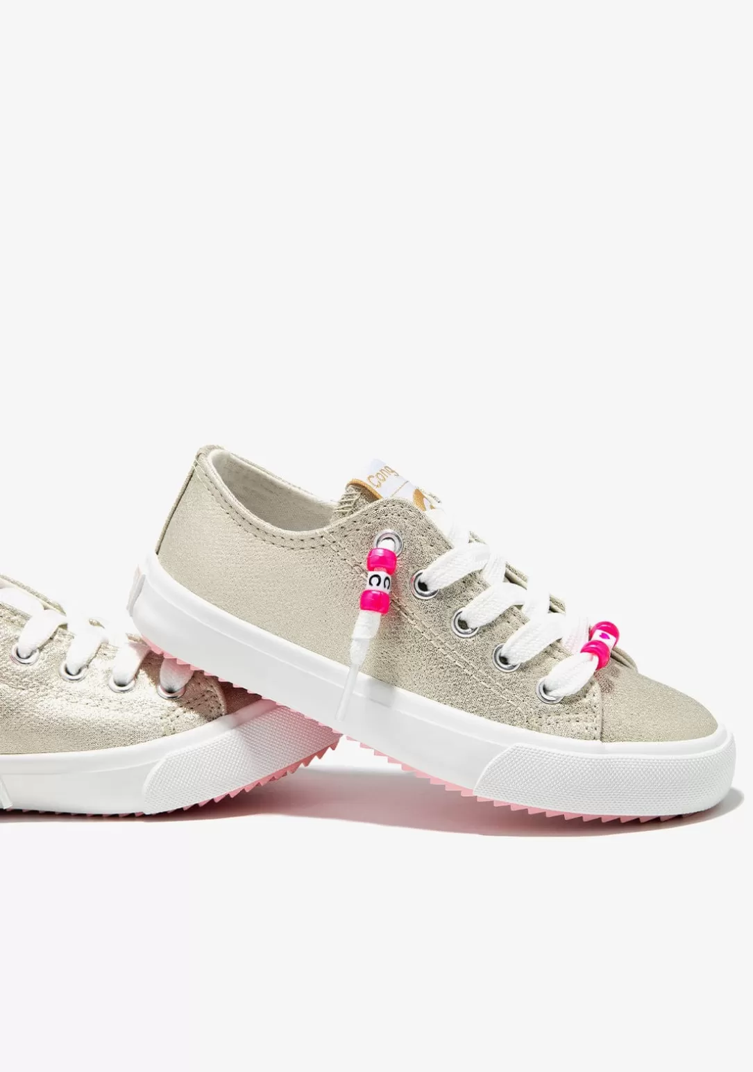 El modelo dorado cuenta con cordones de algodón ajustables decorados con cuentas rosas. Además, su suela cuenta con un refuerzo de goma en la puntera para mayor durabilidad.