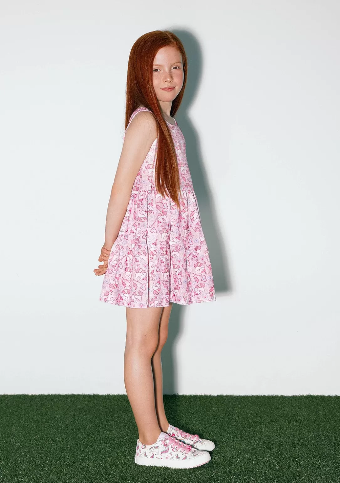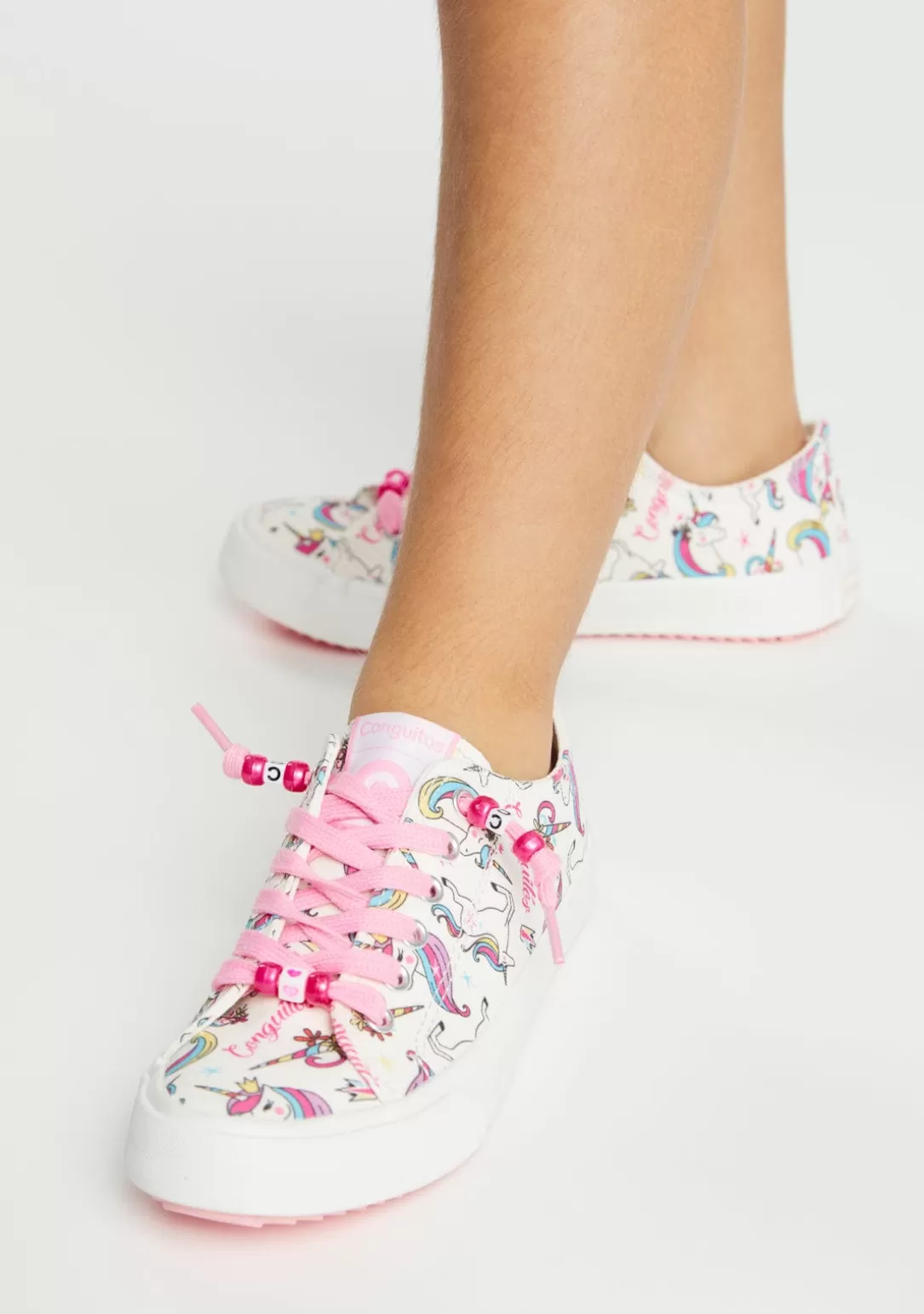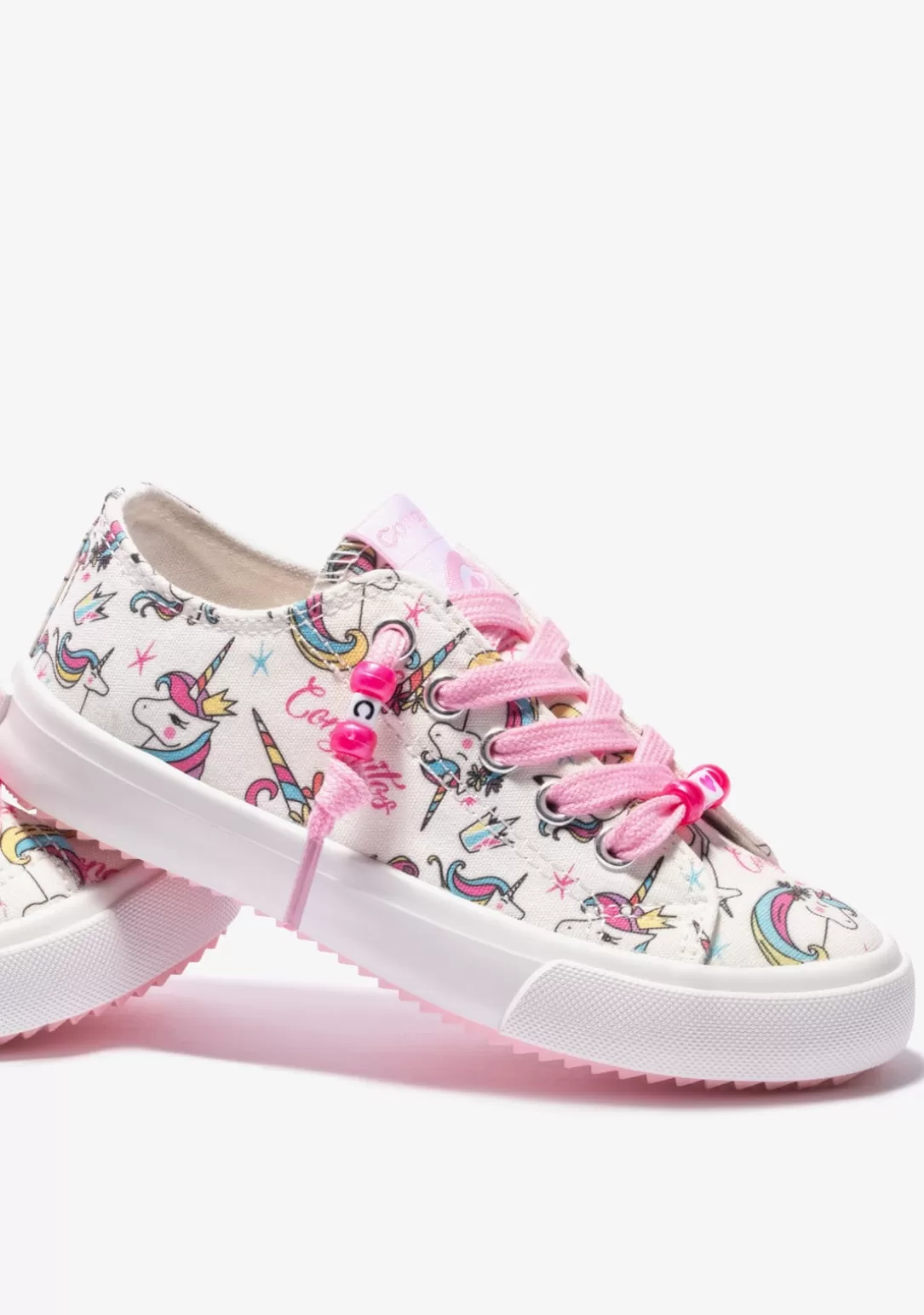Las zapatillas de lona cuentan con estampado de unicornios de colores. Tienen elástico en el interior que facilita ponerlas y quitarlas con comodidad. Están decoradas con cuentas rosas y tienen el logo en el talón.