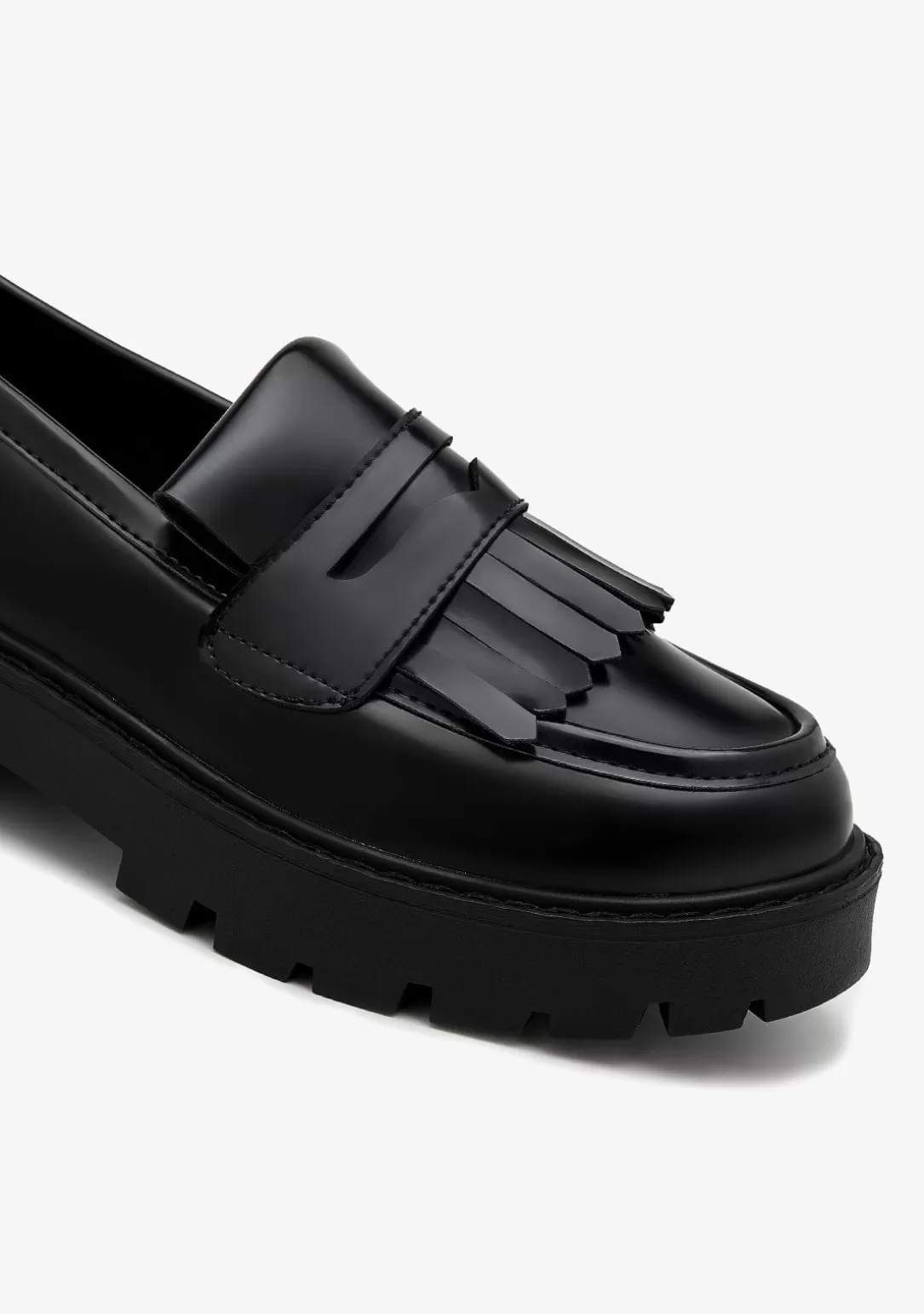Zapato tipo mocasín en color negro con detalle de flecos en la parte frontal. Para los estilismos más formales del día a día.