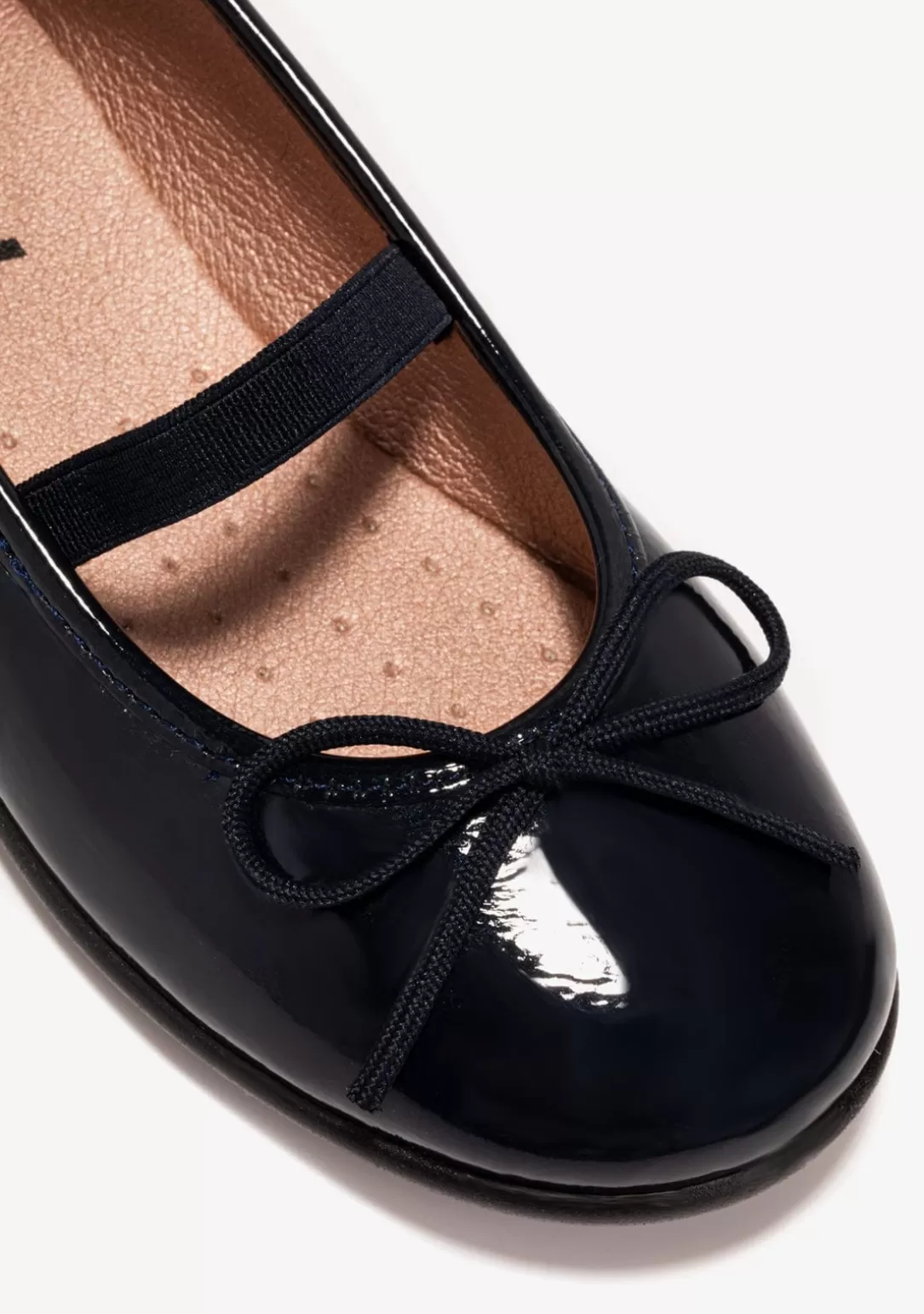 Bailarinas fabricadas en charol sintético con tira elástica en el empeine para una correcta sujeción. Disponen de plantilla transpirable en material textil. Estas manoletinas tienen la suela de goma inyectada para máxima comodidad de la niña y detalle de lazo en la puntera.